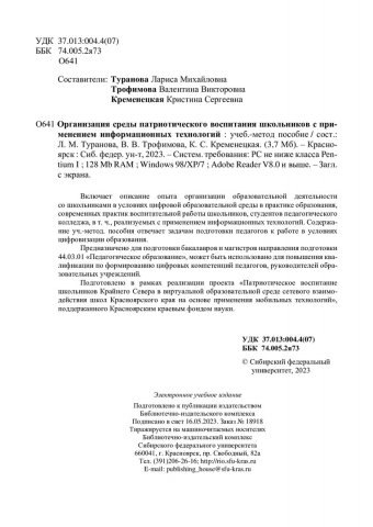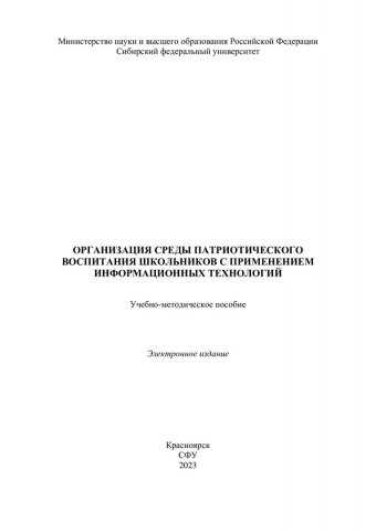 Библиографическое описание: Организация среды патриотического воспитания школьников с применением информационных технологий : учебно-методическое пособие / Сиб. федер. ун-т, Ин-т педагогики, психологии и социологии ; сост.: Л. М. Туранова, В. В. Трофимова, К. С. Кременецкая. - Электрон. текстовые дан. (pdf 3,6 Мб). - Красноярск : СФУ, 2023 (2023-05-04). - 56 с. - Загл. с титул. экрана. - Изд. № 2023-18918 : Б. ц. - Текст : электронный.