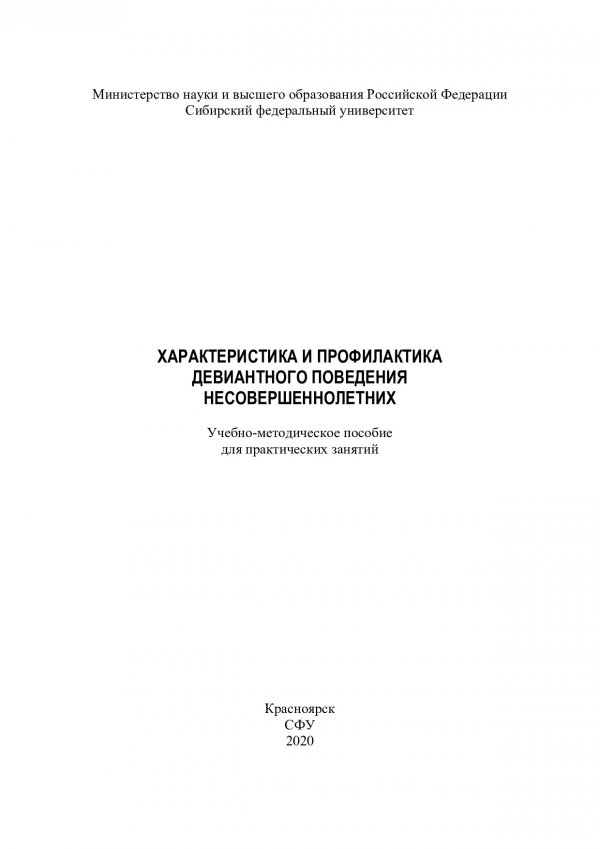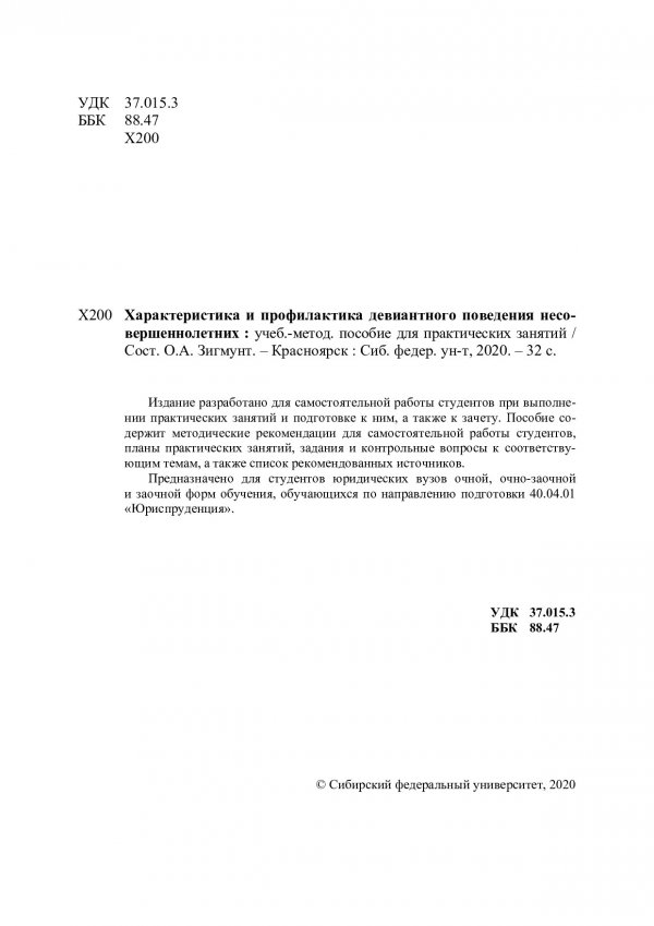 Библиографическое описание:Характеристика и профилактика девиантного поведения несовершеннолетних : учебно-методическое пособие для практических занятий / Сиб. федер. ун-т, Юрид. ин-т ; сост. О. А. Зигмунт. - Электрон. текстовые дан. (pdf, 0,4 Мб). - Красноярск : СФУ, 2020 (2020-03-27). - 30 с. - Загл. с титул. экрана. - Изд. № 2020-11253 : Б. ц. - Текст : электронный.