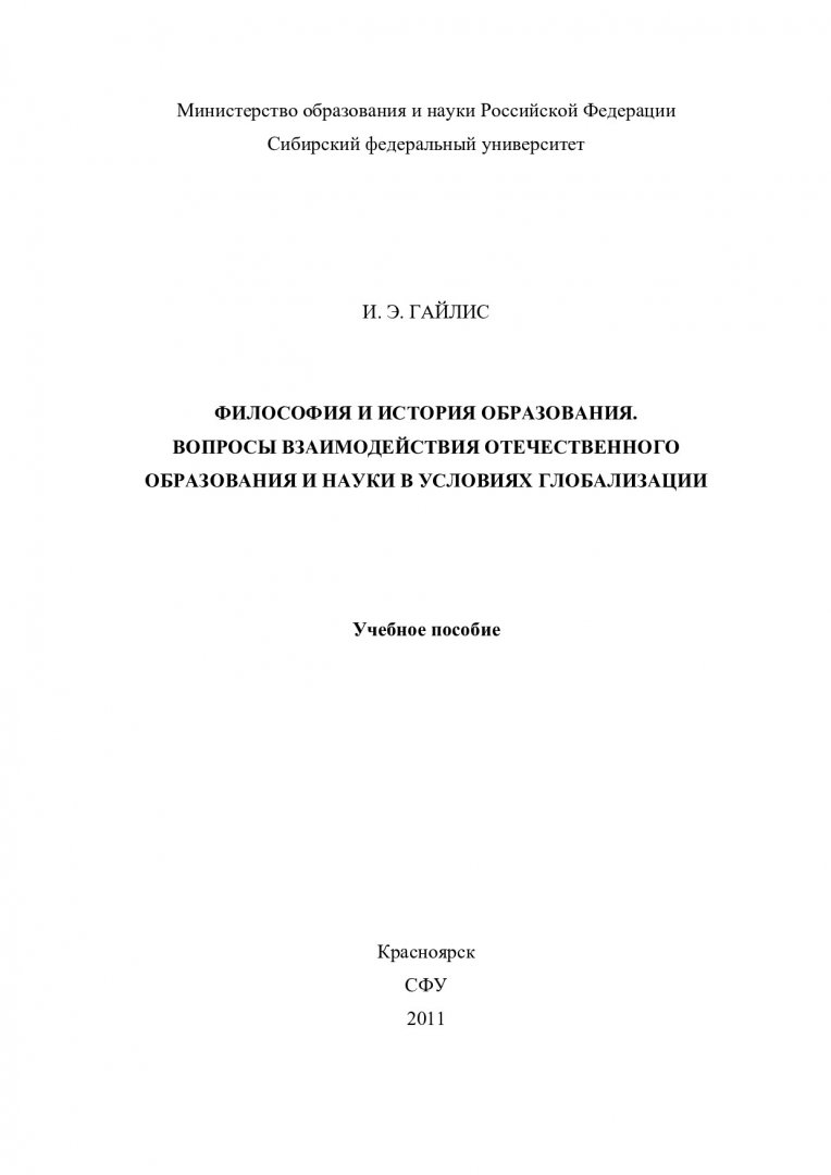 Библиографическое описание:Гайлис, Инесса Эмилевна. Философия и история образования. Вопросы взаимодействия отечественного образования и науки в условиях глобализации : учебное пособие / И. Э. Гайлис ; Сибирский федеральный университет. - Электрон. текстовые дан. (pdf ; 759 Кб). - Красноярск : СФУ, 2011. - 85 с. : табл., ил. - Загл. с титул. экрана. - Электрон. версия печ. публикации . - Библиогр.: с. 83-85. - ISBN 978-5-7638-2236-6 : 54.00 р. - Текст : электронный.