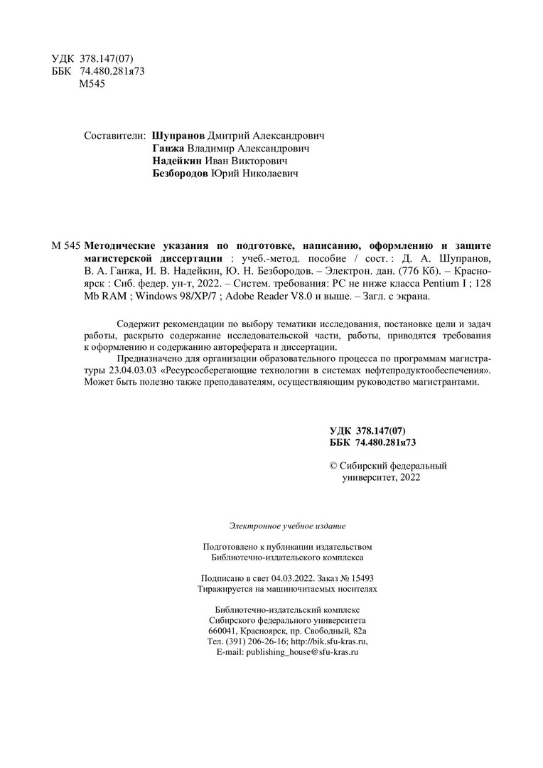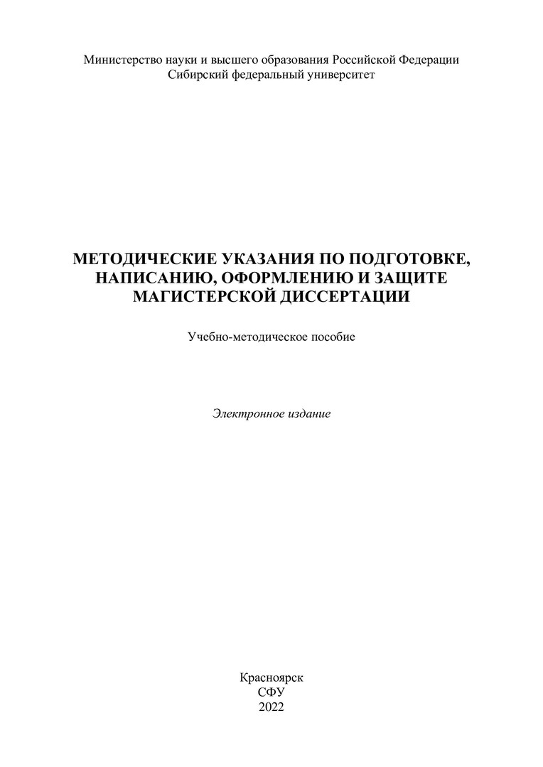 Библиографическое описание:Методические указания по подготовке, написанию, оформлению и защите магистерской диссертации : учебно-методическое пособие / Сиб. федер. ун-т, Ин-т нефти и газа ; сост. Д. А. Шупранов [и др.]. - Электрон. текстовые дан. (pdf, 0,8 Мб). - Красноярск : СФУ, 2022 (2022-01-24). - 71 с. - Загл. с титул. экрана. - Изд. № 2022-15493 : Б. ц. - Текст : электронный.