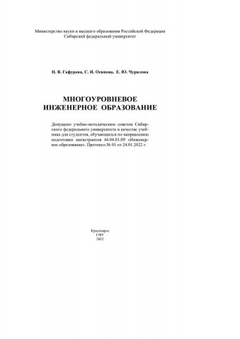 Библиографическое описание: Гафурова, Наталия Владимировна. Многоуровневое инженерное образование : учебник для студентов, обучающихся по направлению подготовки магистрантов 44.04.01.09 «Инженерное образование» / Н. В. Гафурова, С. И. Осипова, Е. Ю. Чурилова ; рец.: Е. А. Барахсанова, В. В. Кольга ; Сибирский федеральный университет, Институт цветных металлов и материаловедения. - Электрон. текстовые дан. (17,6 Мб). - Красноярск : СФУ, 2022 (2022-12-28). - 316 с., 25.7 усл. печ. л. : схемы, табл. - Загл. с титул. экрана. - Электрон. версия печ. публикации . - Библиогр.: с. 280-294. - 500 экз. - ISBN 978-5-7638-4591-4 : Б. ц. - Изд. № 2021-14627. - Текст : электронный.