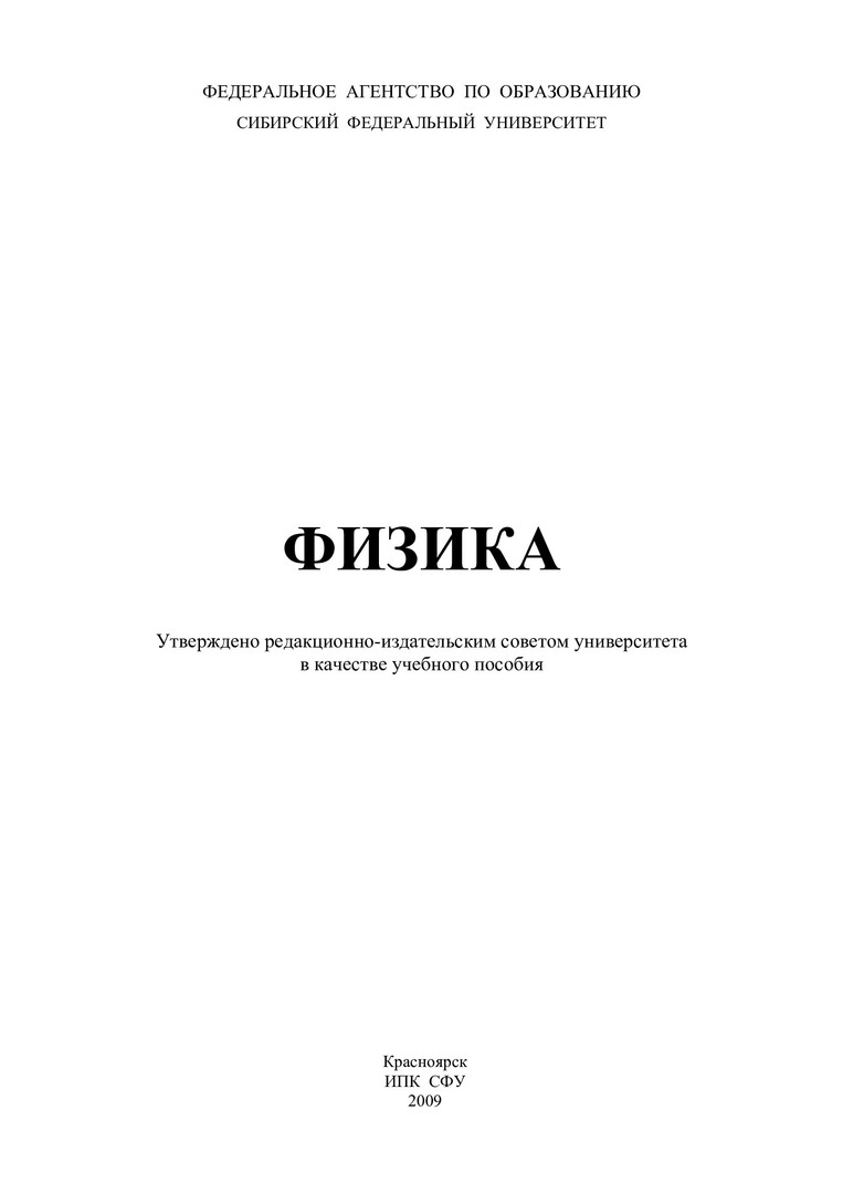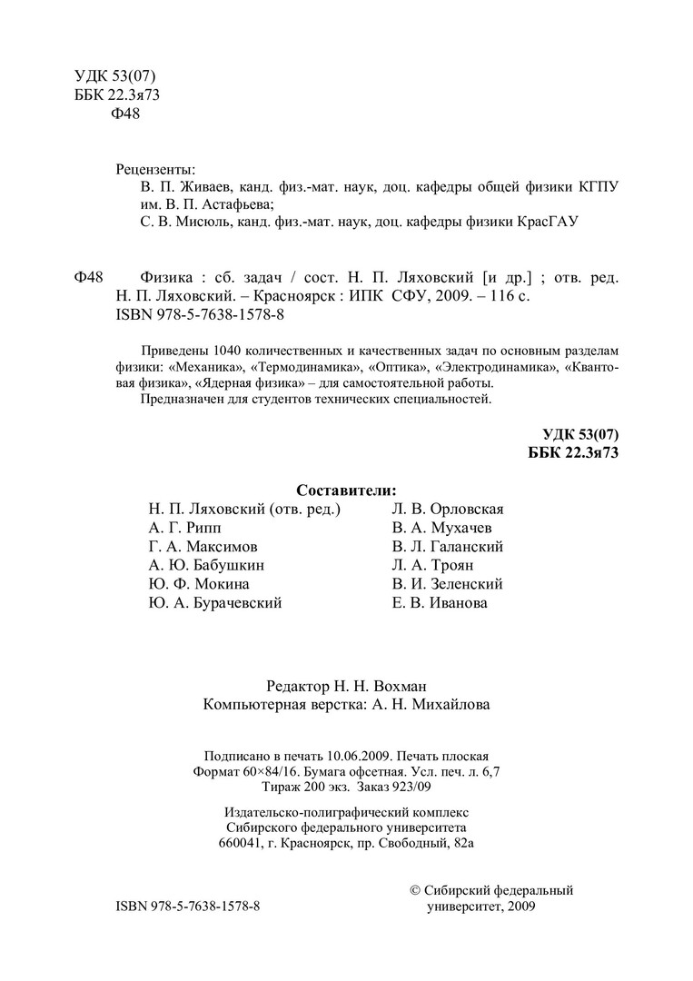 Библиографическое описание: Физика : сб. задач / Сиб. федерал. ун-т ; ред. Н. П. Ляховский ; сост. Н. П. Ляховский [и др.]. - Красноярск : ИПК СФУ, 2009. - 116 с. - 200 экз. - ISBN 978-5-7638-1578-8. - Текст : непосредственный + Текст : электронный.