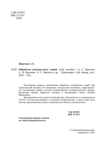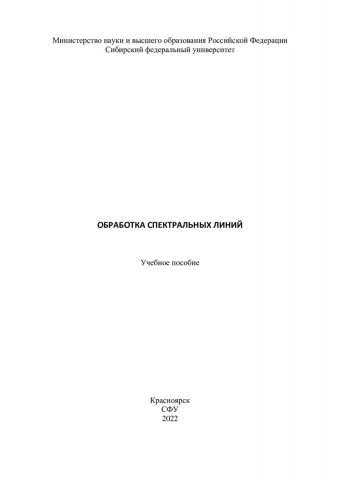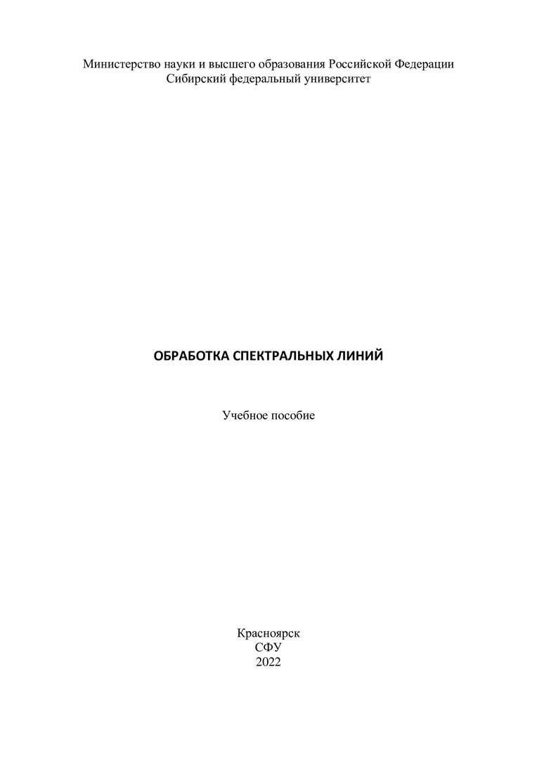 Библиографическое описание: Обработка спектральных линий : учебное пособие / А. С. Ципотан, С. Н. Крылова, А. С. Крылов [и др.] ; Сибирский федеральный университет, Институт инженерной физики и радиоэлектроники. - Электрон. текстовые дан. (pdf ; 2,3 Мб). - Красноярск : СФУ, 2022 (2022-06-03). - 56 с. - Загл. с титул. экрана. - Электрон. версия печ. публикации . - Библиогр.: с. 53. - 100 экз. - Изд. № 2022-16435 : Б. ц. - Текст : электронный.