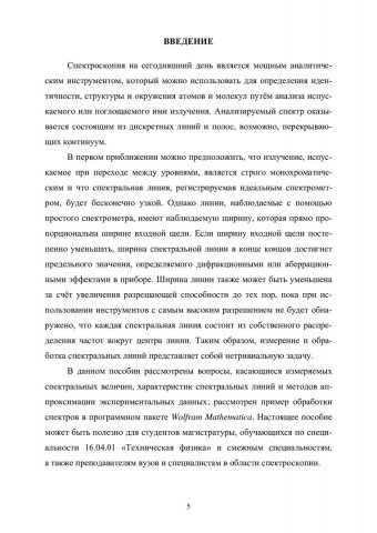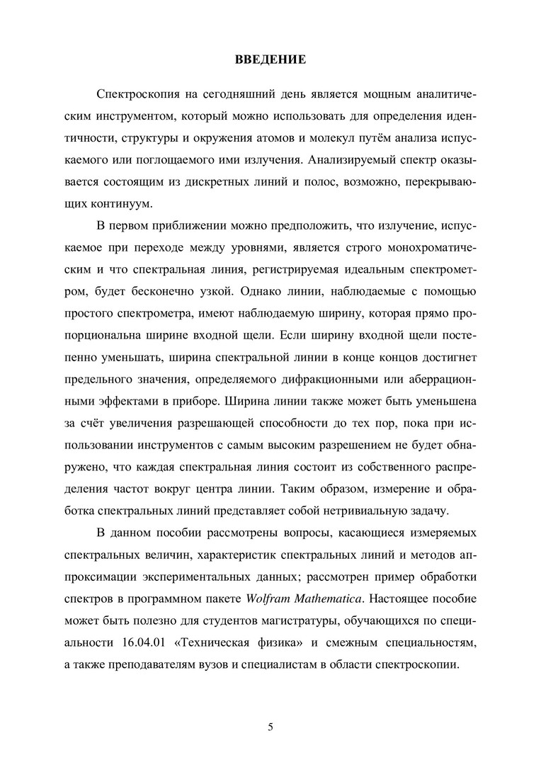 Аннотация: Рассмотрены вопросы, посвященные обработке спектральных линий. Дан теоретический материал об измеряемых спектральных величинах, характеристиках спектральных линий и методах аппроксимации экспериментальных данных, рассмотрен пример обработки спектров в программном пакете Wolfram Mathematica. Предназначено для студентов магистратуры, обучающихся по специальности 16.04.01 «Техническая физика» и смежным специальностям, а также может быть полезно преподавателям вузов и специалистам в области спектроскопии.