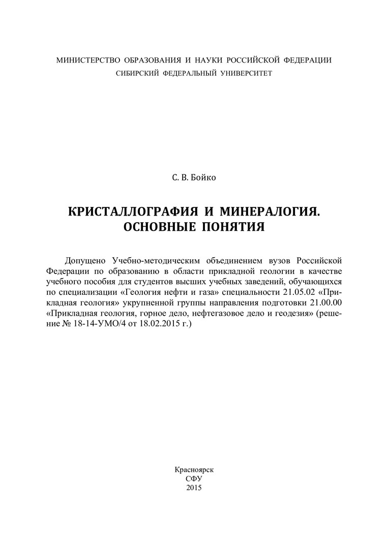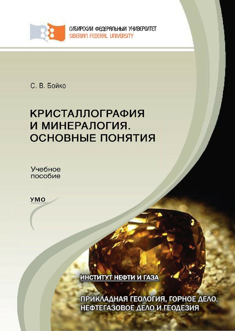 Библиографическое описание: Бойко, Сергей Васильевич. Кристаллография и минералогия. Основные понятия : учебное пособие для студентов вузов, обучающихся по специализации "Геология нефти и газа" специальности 21.05.02 "Прикладная геология" / С. В. Бойко ; Сиб. федер. ун-т, Ин-т нефти и газа. - Красноярск : СФУ, 2015. - 211 с. : цв. ил. - Библиогр.: с. 190-194. - 500 экз. - ISBN 978-5-7638-3223-5 : 588.00 р., 433.00 р. - Изд. № 2015-958. - Текст : непосредственный + Текст : электронный.
