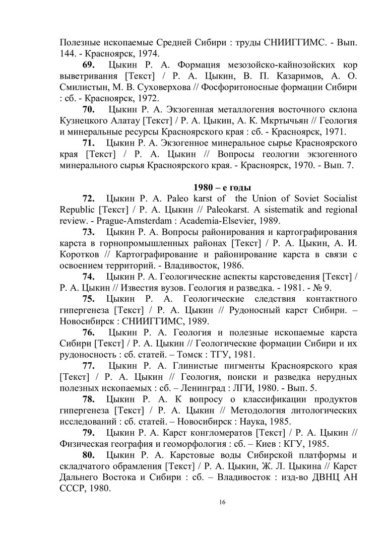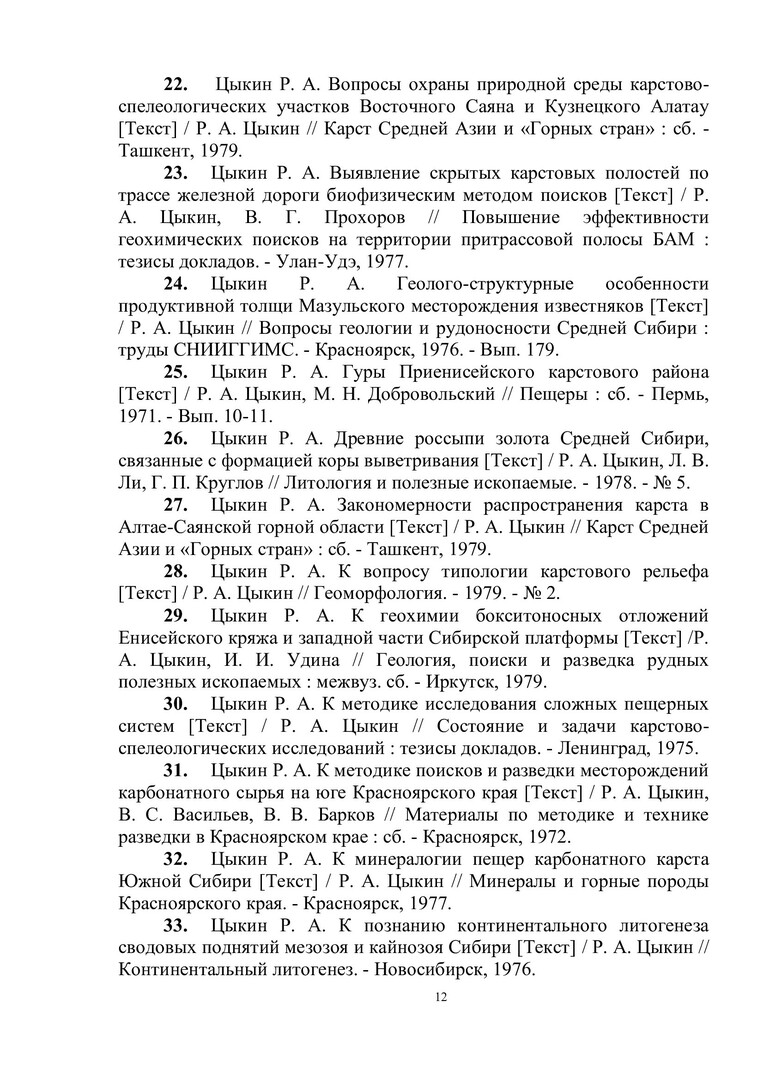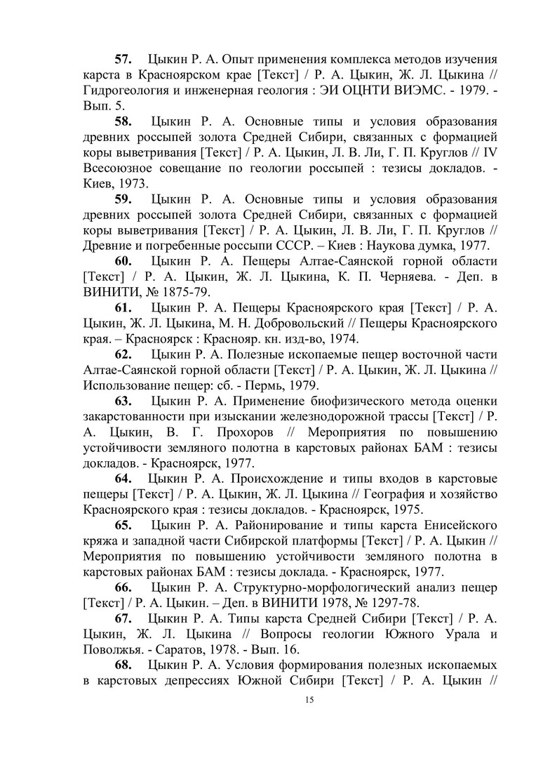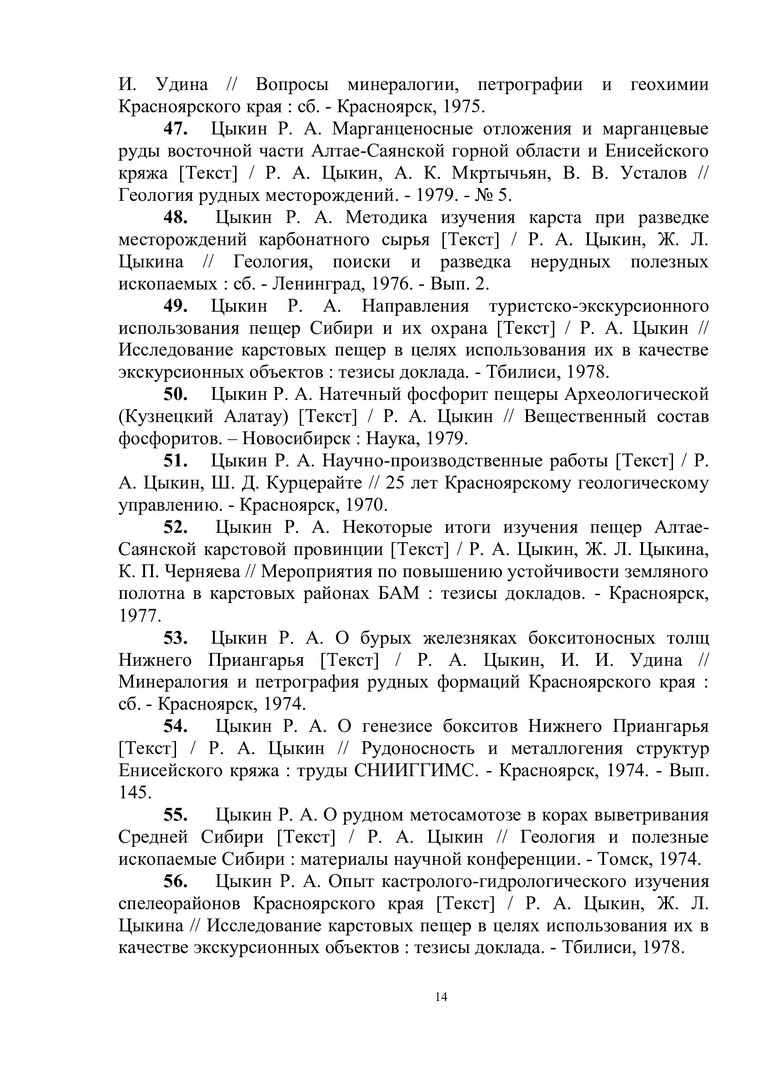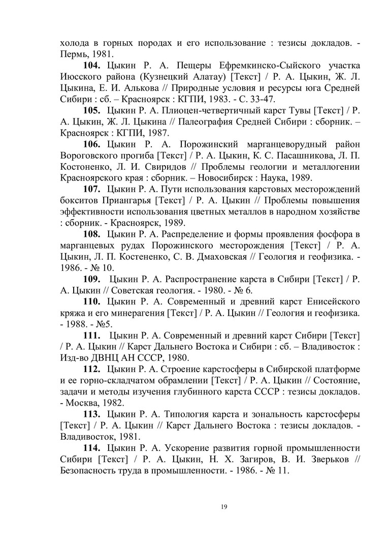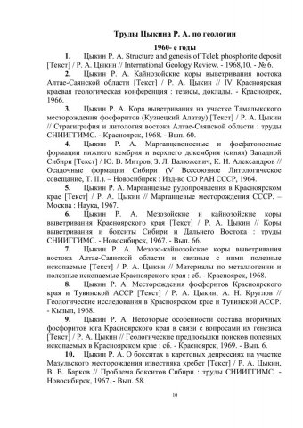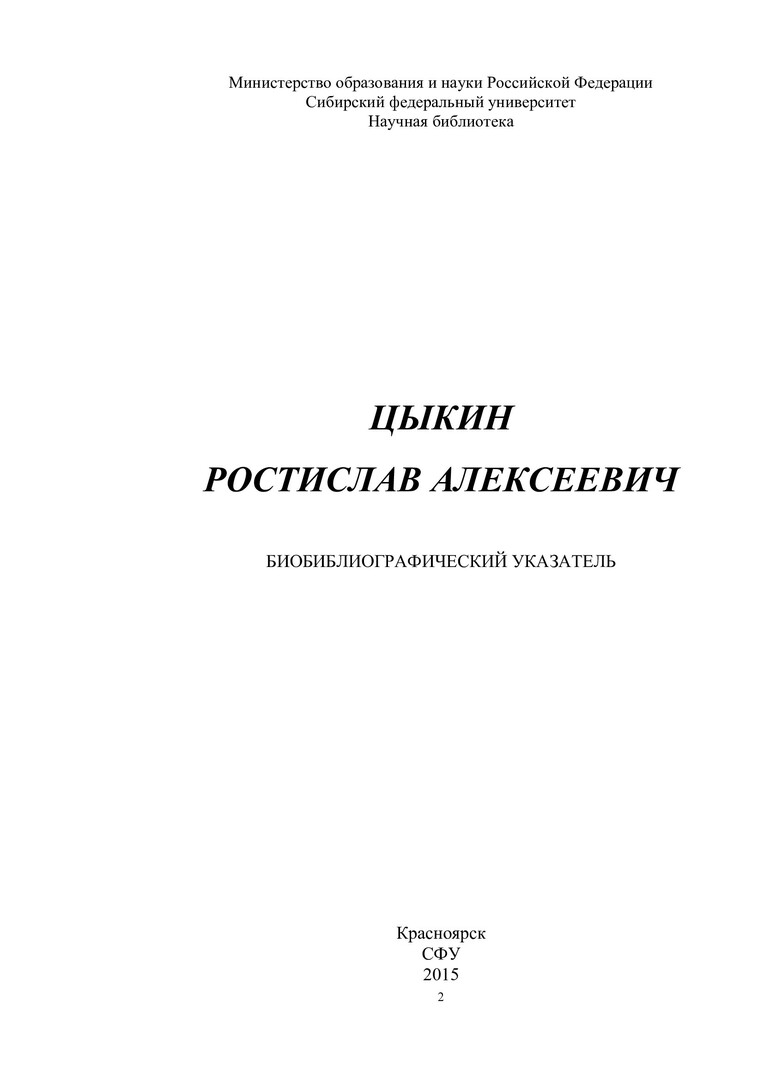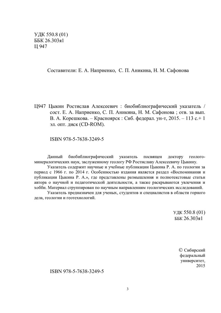Библиографическое описание:Цыкин Ростислав Алексеевич : биобиблиографический указатель / Сибирский федеральный университет, Научная библиотека ; [сост.: Е. А. Наприенко, С. П. Аникина, Н. М. Сафонова ; отв. за вып. В. А. Корешкова]. - Красноярск : СФУ, 2015. - 112 с. : ил., цв. ил. + 1 эл. опт. диск (CD-ROM). - (Биобиблиография ученых СФУ). - 100 экз. - ISBN 978-5-7638-3249-5 : 151.00 р. - Изд. № 2015-1449. - Текст : непосредственный + Текст : электронный.