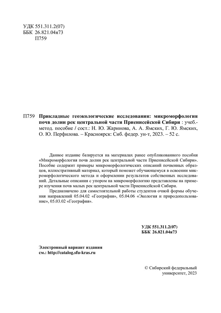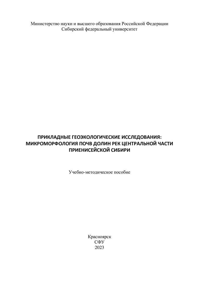 Библиографическое описание: Прикладные геоэкологические исследования: микроморфология почв долин рек центральной части Приенисейской Сибири : учебно-методическое пособие / Сиб. федер. ун-т, Ин-т экологии и географии ; сост. Н. Ю. Жаринова [и др.]. - Электрон. текстовые дан. (pdf, 4,5 Мб). - Красноярск : СФУ, 2023 (2023-05-24). - 52 с. - Загл. с титул. экрана. - Изд. № 2023-19044 : Б. ц. - Текст : электронный.
