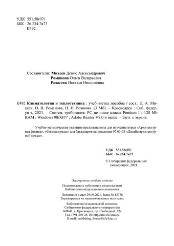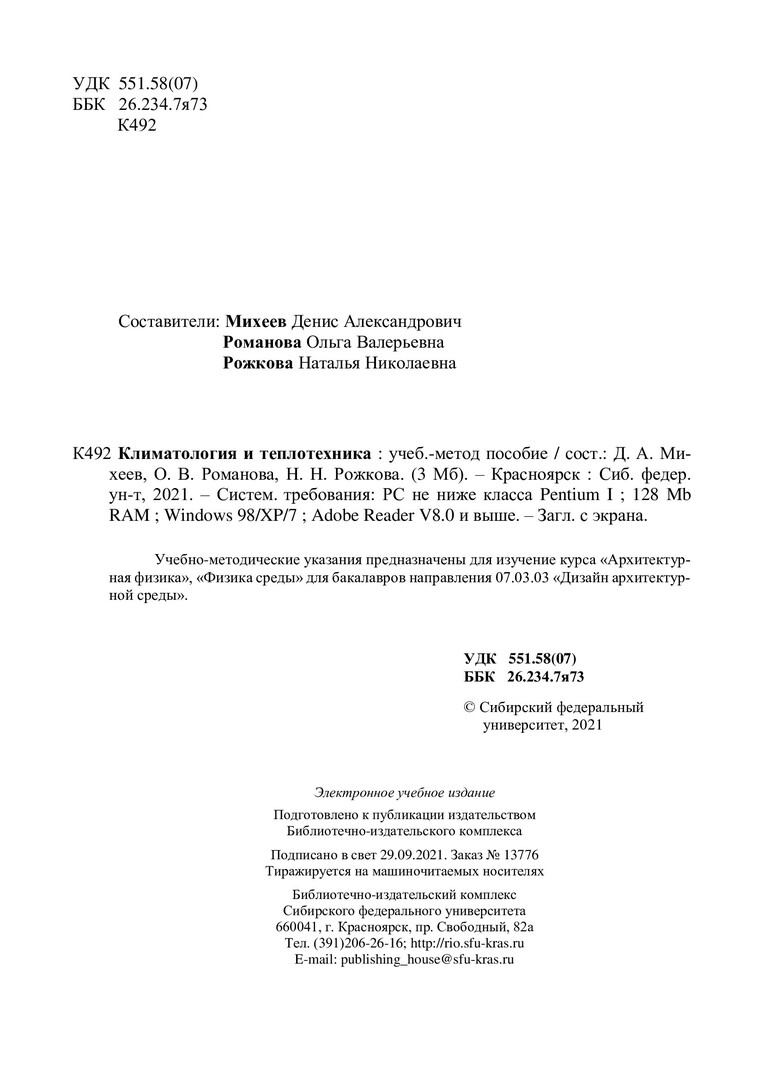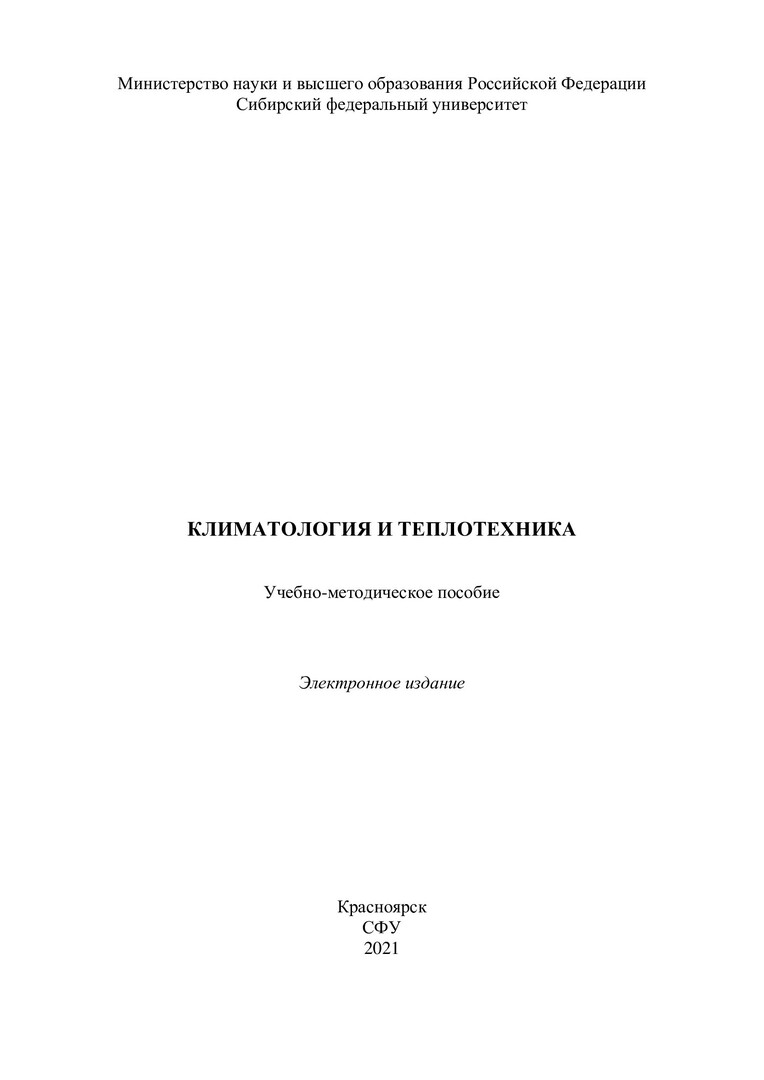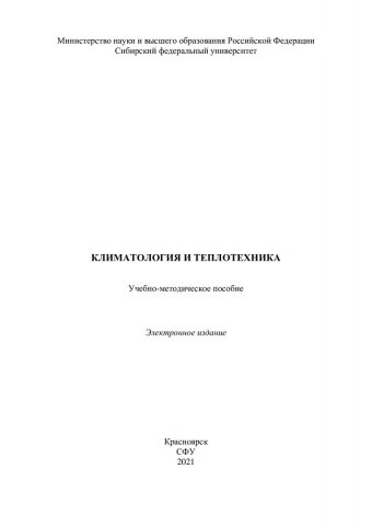 Библиографическое описание:Климатология и теплотехника : учебно-методическое пособие / Сиб. федер. ун-т, Инж.-строит. ин-т ; сост.: Д. А. Михеев, О. В. Романова, Н. Н. Рожкова. - Электрон. текстовые дан. (pdf, 3 Мб). - Красноярск : СФУ, 2021 (2021-05-20). - 109 с. - Загл. с титул. экрана. - Изд. № 2021-13776 : Б. ц. - Текст : электронный.