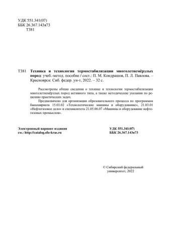 Библиографическое описание:Техника и технология термостабилизации многолетнемерзлых пород : учебно-методическое пособие / сост.: П. М. Кондрашов, П. Л. Павлова. - Электрон. текстовые дан. (1,0 Мб). - Красноярск : СФУ, 2022 (2022-07-14). - 32 с., 2.0 усл. печ. л. : ил., табл. - Загл. с титул. экрана. - Электрон. версия печ. публикации . - Библиогр.: с. 28-29. - 100 экз. - Изд. № 2022-16735 : Б. ц. - Текст : электронный.