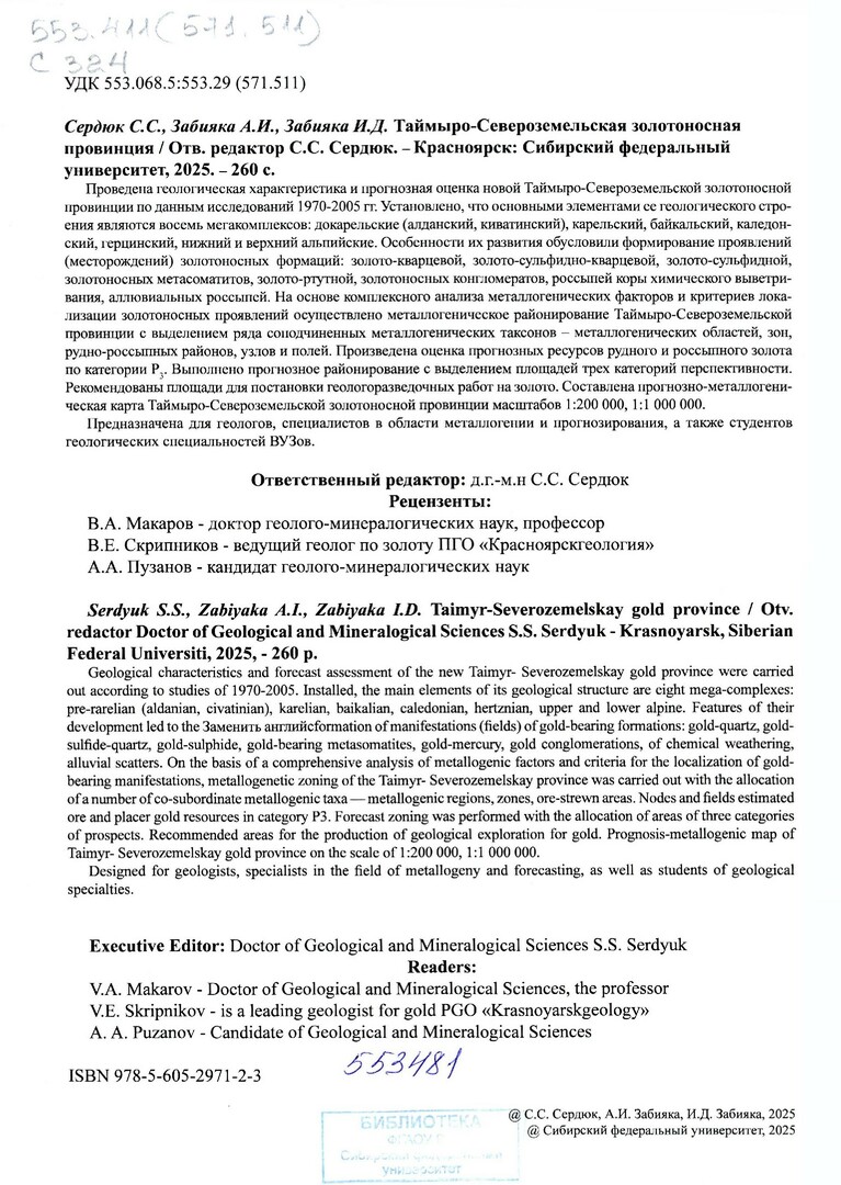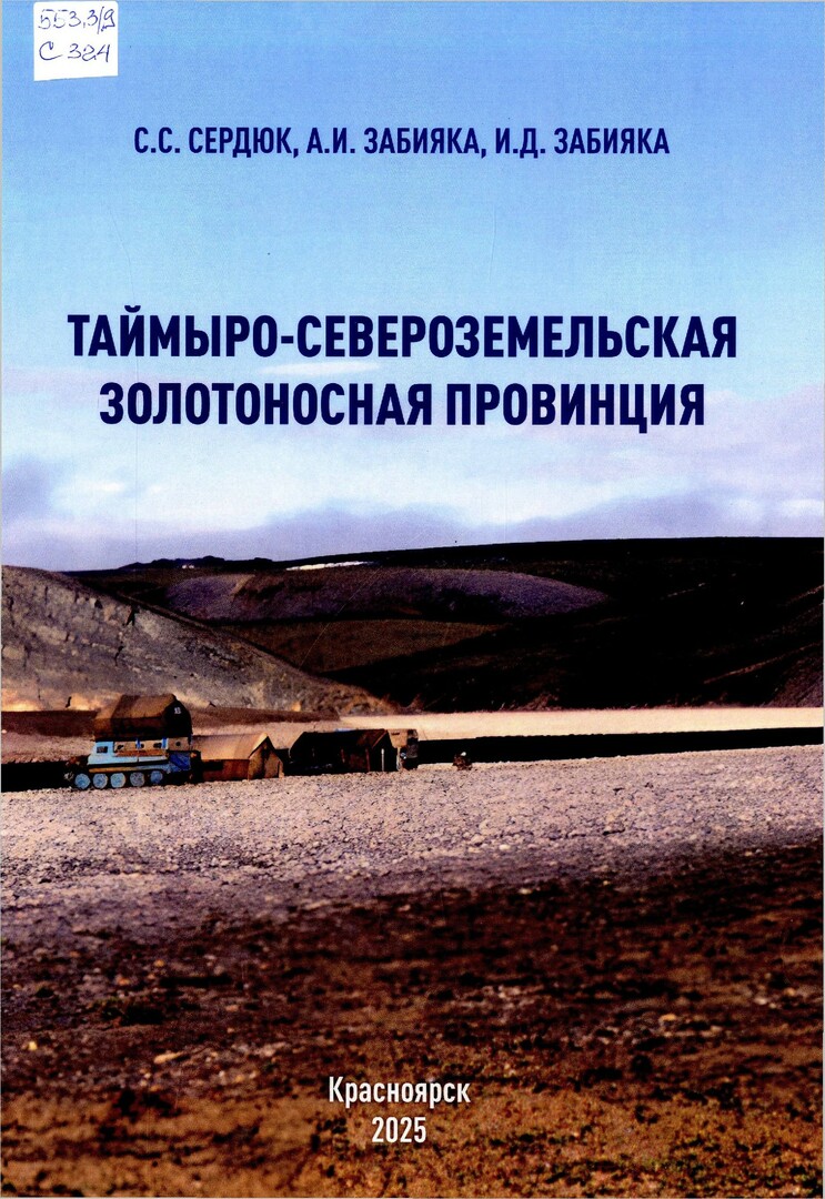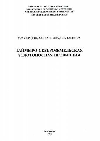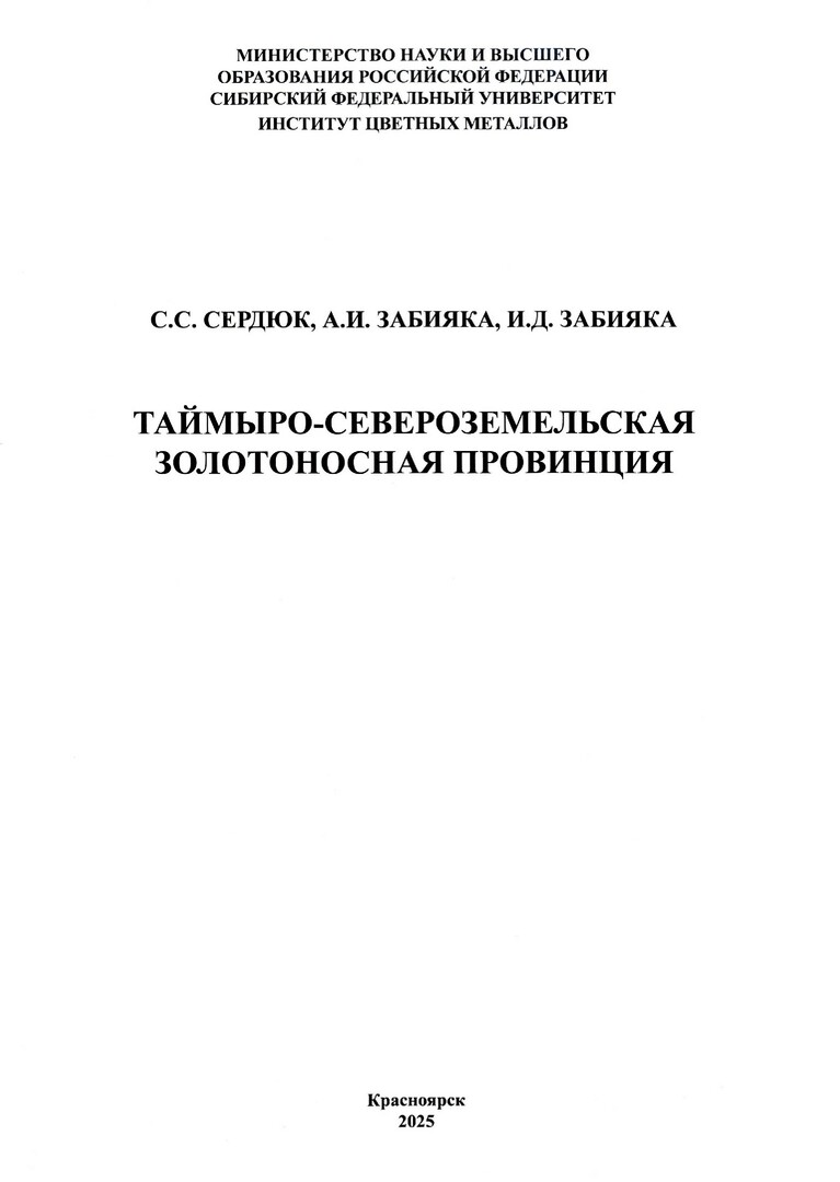 Библиографическое описание: Сердюк, Сергей Станиславович. Таймыро-Североземельская золотоносная провинция / С. С. Сердюк, А. И. Забияка, И. Д. Забияка ; [отв. ред. С. С. Сердюк ; рец.: В. А. Макаров, В. Е. Скрипников, А. А. Пузанов] ; Министерство науки и высшего образования Российской Федерации, Сибирский федеральный университет, Институт цветных металлов. - Красноярск : СФУ, 2025 (2025-01-24). - 257 с., 29,7 усл. печ. л. : ил., табл. - Рез. англ. - Библиогр.: с. 248-257. - ISBN 978-5-605-2971-2-3 (200в пер.) : 1500.00 р. - Текст : непосредственный.