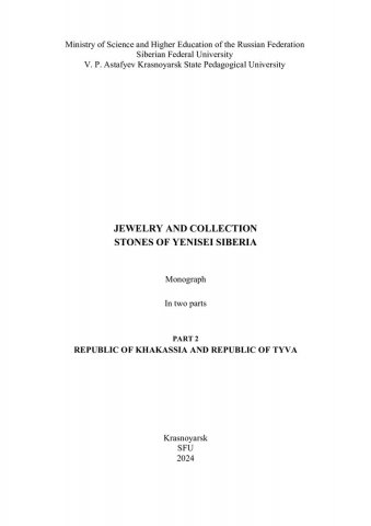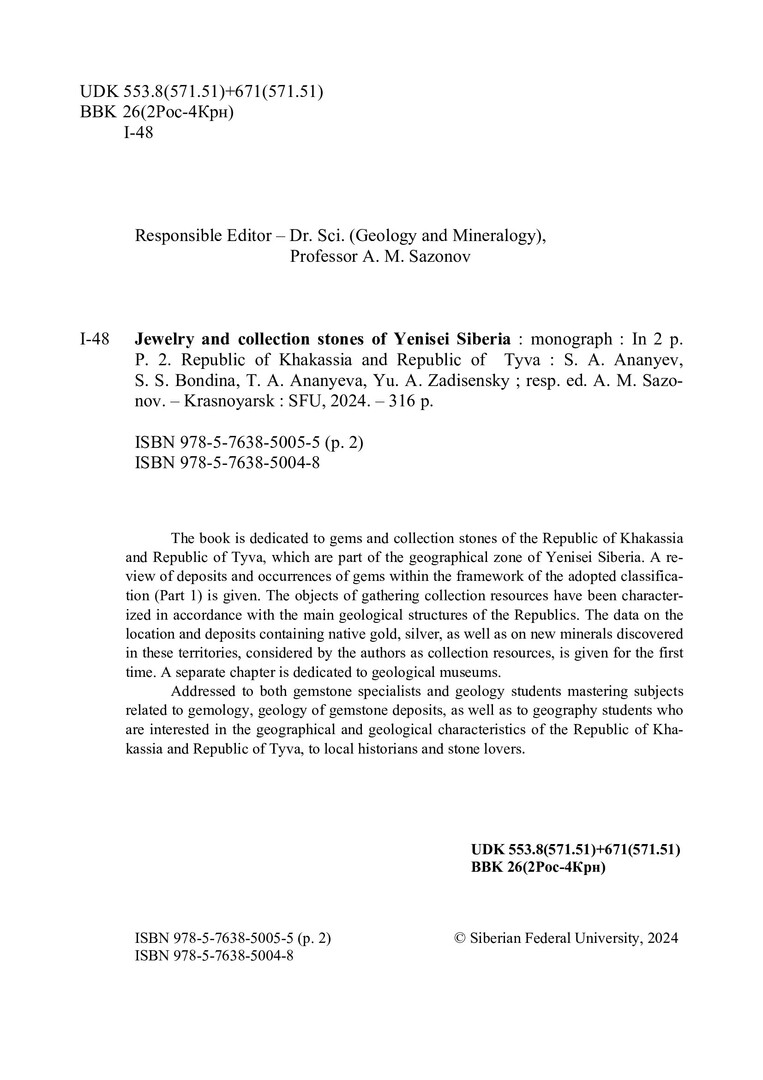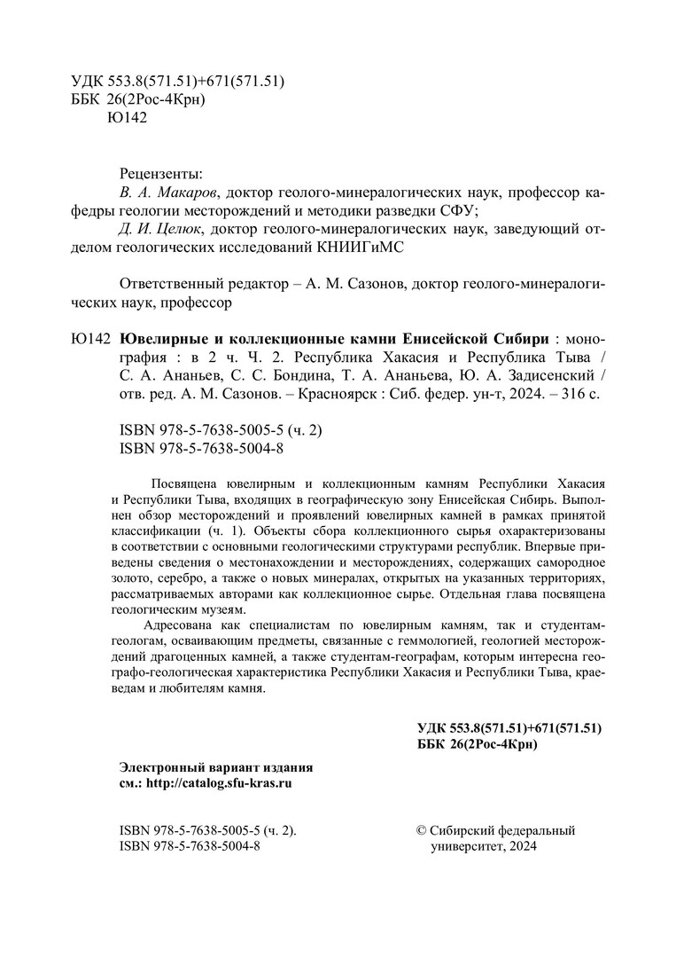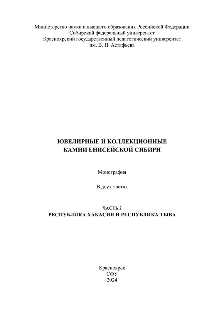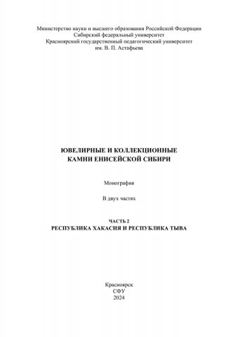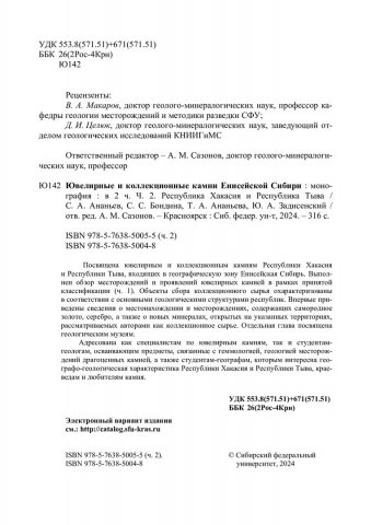 Библиографическое описание:Ювелирные и коллекционные камни Енисейской Сибири = Jewelry and collection stones of yenisei Siberia : монография: в 2 частях / С. А. Ананьев, С. С. Бондина, Т. А. Ананьева, Ю. А. Задисенский ; отв. ред. А. М. Сазонов ; рец.: В. А. Макаров, Д. И. Целюк ; Сибирский федеральный университет, Институт цветных металлов, Красноярский государственный педагогический университет им. В. П. Астафьева. - Электрон. текстовые дан. (326,0 Мб). - Красноярск : СФУ, 2024 . - Загл. с титул. экрана. - Электрон. версия печ. публикации . - ISBN 978-5-7638-5004-8. - Текст : электронный. Ч. 2 : Республика Хакасия и республика Тыва = Republic of Khakassia and republic of Tyva. - 2024 (2024-11-20). - 316 с. : цв. ил. - Текст на англ. и рус. яз. - Библиогр.: с. 303-312. - 500 экз. - ISBN 978-5-7638-5005-5 : Б. ц. - Изд. № 2024-22137