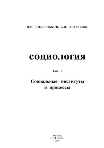 Библиографическое описание:Добреньков, Владимир Иванович. Социология : в 3-х т. / В. И. Добреньков, А. И. Кравченко. - Москва : ИНФРА-М, 2000 - . Т. 3 : Социальные институты и процессы. - 520 с. - ISBN 5160003657 (в пер.) : 120.00 р.