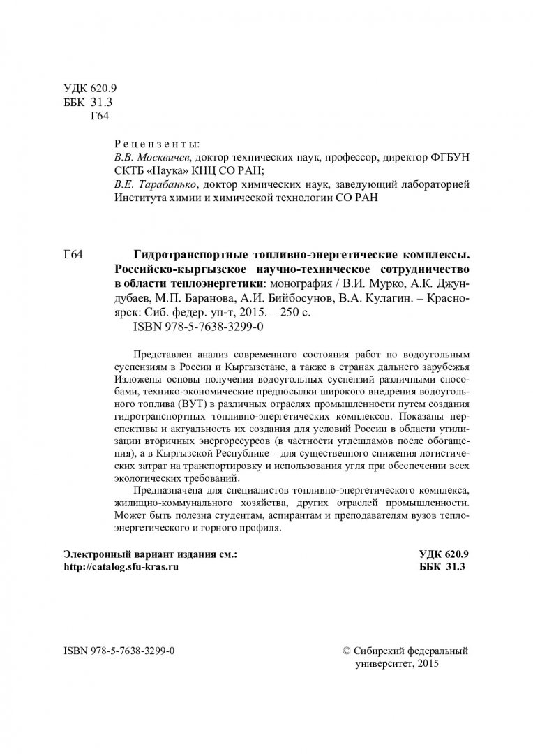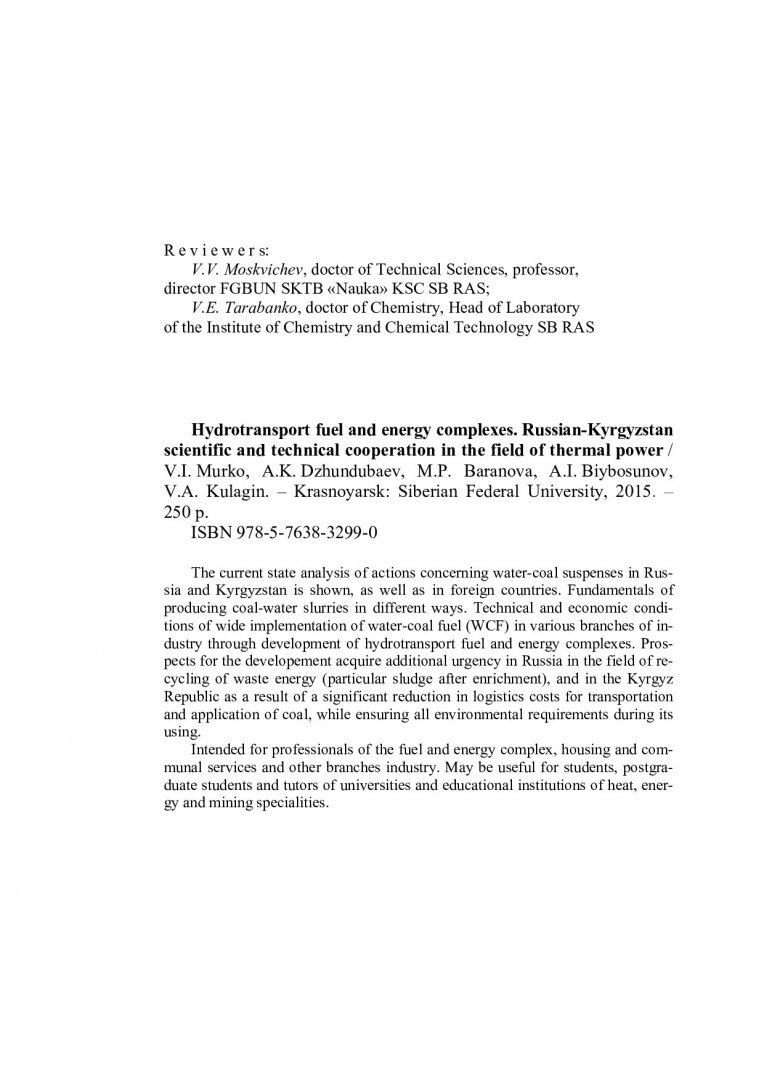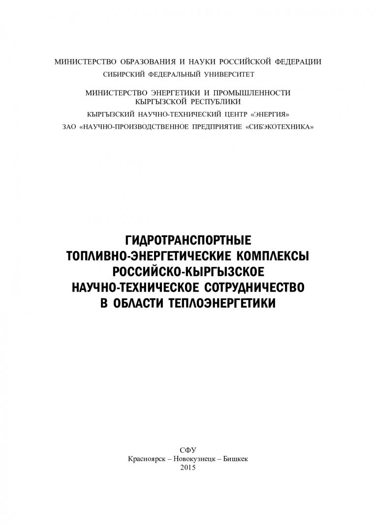 Библиографическое описание: Гидротранспортные топливно-энергетические комплексы. Российско-кыргызское научно-техническое сотрудничество в области теплоэнергетики = Hydrotransport fuel and energy complexes. Russian-Kyrgyzstan scientific and technical cooperation in the flied of thermal power : [монография] / В. И. Мурко [и др.] ; Сиб. федер. ун-т, Кыргыз. науч.-техн. центр "Энергия", ЗАО "Науч.-произв. предприятие "Сибэкотехника". - Красноярск ; Новокузнецк ; Бишкек : СФУ, 2015. - 248 с. : ил., цв. ил., табл. - Библиогр.: с. 242-248. - ISBN 978-5-7638-3299-0 : 222.00 р. - Изд. № 2015-2315. - Текст : непосредственный + Текст : электронный.