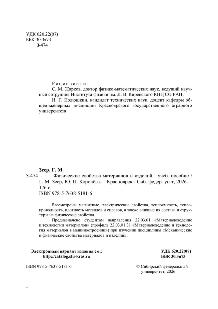 Библиографическое описание: Зеер, Галина Михайловна. Физические свойства материалов и изделий : учебное пособие / Г. М. Зеер, Ю. П. Королева ; рец.: С. М. Жарков, Н. Г. Полюшкин ; Сибирский федеральный университет, Политехнический институт. - Электрон. текстовые дан. (pdf, 4.3 Мб). - Красноярск : СФУ, 2026 (2026-03-24). - 176 с., 11.0 усл. печ. л. : граф., ил., схемы. - Загл. с титул. экрана. - Электрон. версия печ. публикации . - Библиогр.: с. 174. - 100 экз. - ISBN 978-5-7638-5181-6 : Б. ц. - Изд. № 2025-25357. - Текст : электронный.
