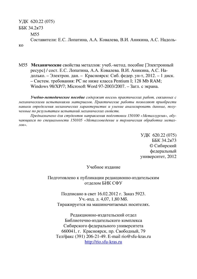 Библиографическое описание:Механические свойства металлов : учеб.-метод. пособие [для практ. работ] / Сиб. федерал. ун-т ; сост. Е. С. Лопатина [и др.]. - Электрон. текстовые дан. (PDF, 1,4 Мб). - Красноярск : СФУ, 2012. - Загл. с титул. экрана. - Библиогр.: с. 81. - ISSN http://li. - Текст : электронный.