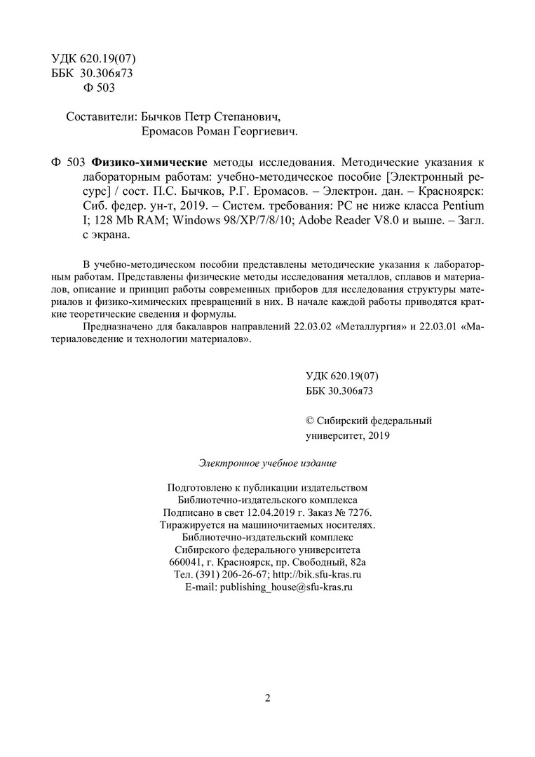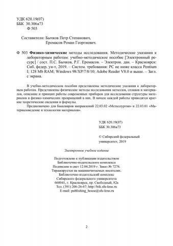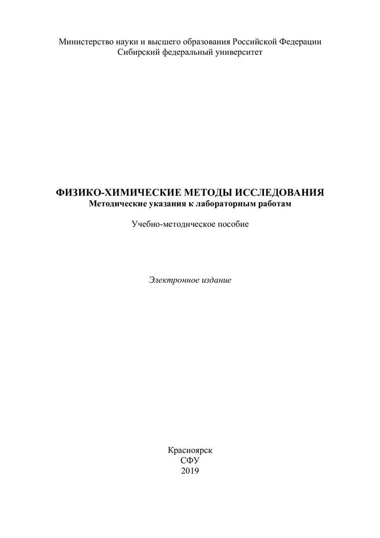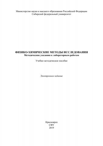 Библиографическое описание: Физико-химические методы исследования. Методические указания к лабораторным работам : учебно-методическое пособие / Сиб. федер. ун-т, Ин-т цвет. металлов и материаловедения ; сост.: П. С. Бычков, Р. Г. Еромасов. - Электрон. текстовые дан. (pdf, 0,9 Мб). - Красноярск : СФУ, 2019. - Загл. с титул. экрана. - Изд. № 2018-7276 : Б. ц. - Текст : непосредственный.