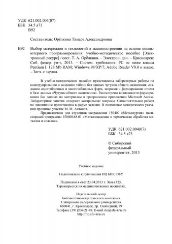Библиографическое описание:Выбор материалов и технологий в машиностроении на основе компьютерного программирования : учеб.-метод. пособие [для студентов напр. 150400.68.01 «Металловедение и термическая обработка металлов и сплавов»] / Сиб. федерал. ун-т ; сост. Т. А. Орелкина. - Электрон. текстовые дан. (PDF, 1 Мб). - Красноярск : СФУ, 2013. - (Магистратура). - Загл. с титул. экрана. - Библиогр.: с. 42. - Изд. № 2013-825. - Текст : электронный.