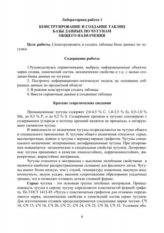 Аннотация:В учебно-методическом пособии представлены лабораторные работы по конструированию и созданию таблиц баз данных чугунов общего назначения, созданию однотабличных и многотабличных форм, запросов и формирование отчета в базе данных «Чугуны общего назначения». Рассмотрены возможности формирования баз данных по материалам в программном приложении Microsoft Access. Лабораторные занятия содержат контрольные вопросы. Самостоятельная работа по дисциплине представлена в форме задания. В подготовке методических указа- ний принимал участие М. М. Антонов. Предназначено для студентов направления 150400 «Металлургия» маги- стерской программы 150400.68.01 «Металловедение и термическая обработка металлов и сплавов».