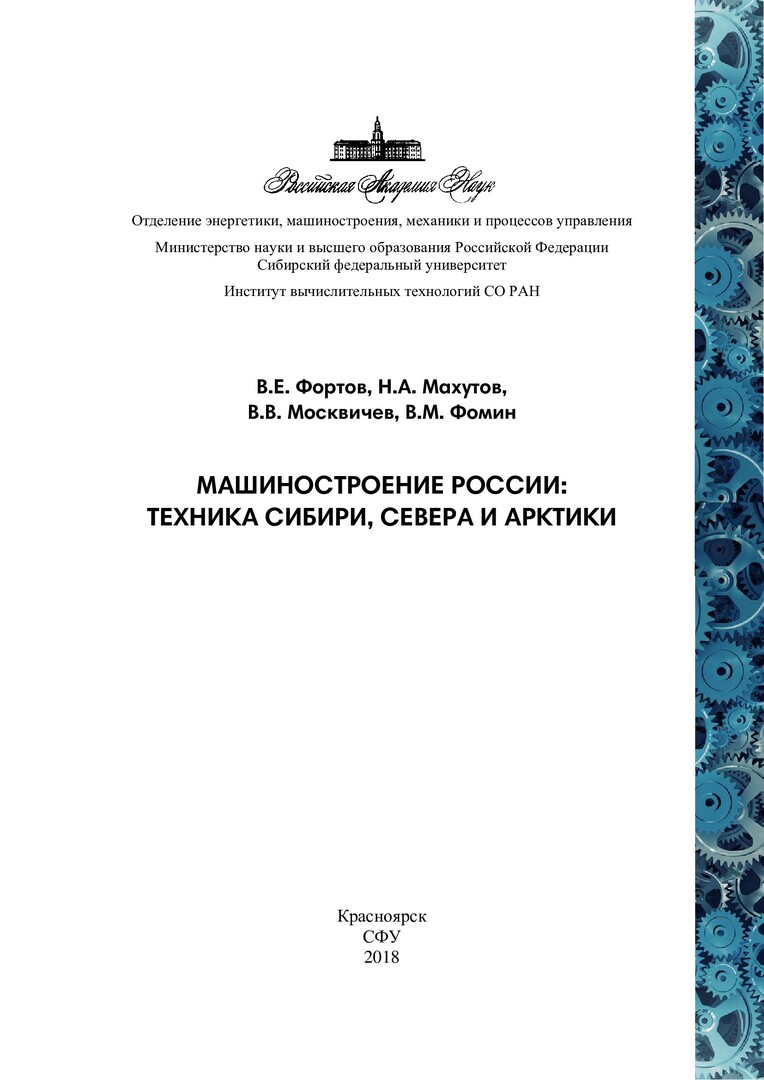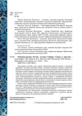 Библиографическое описание: Машиностроение России: техника Сибири, Севера и Арктики : монография / В. Е. Фортов [и др.]. ; Рос. акад. наук, Отд-ние энергетики, машиностроения, механики и процессов упр., Сиб. федер. ун-т, Рос. акад. наук, Сиб. отд-ние, Науч.-образоват. центр ЮНЕСКО. - Красноярск : СФУ, 2018. - 177 с. : ил., цв. ил. - Библиогр.: с. 167-177. - 500 экз. - ISBN 978-5-7638-3966-1 : 760.00 р. - Изд. № 2018-5850. - Текст : непосредственный + Текст : электронный.