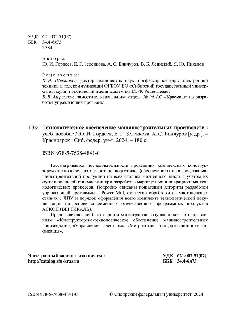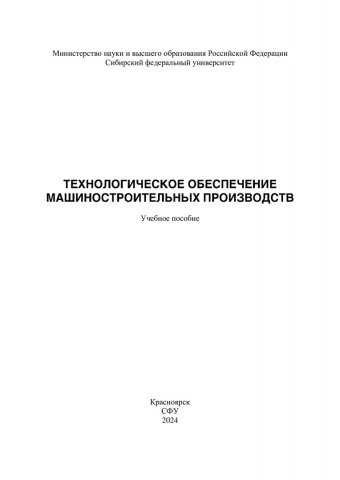 Библиографическое описание: Технологическое обеспечение машиностроительных производств : учебное пособие / Ю. И. Гордеев, Е. Г. Зеленкова, А. С. Бинчуров [и др.] ; рец.: И. Я. Шестаков, В. В. Мерзляков ; Сибирский федеральный университет, Политехнический институт. - Электрон. текстовые дан. (10,3 Мб). - Красноярск : СФУ, 2024 (2024-09-25). - 180 с., 11.2 усл. печ. л. : табл., цв.ил. - Загл. с титул. экрана. - Электрон. версия печ. публикации . - Библиогр.: с. 168-169. - 100 экз. - ISBN 978-5-7638-4841-0 : Б. ц. - Изд. № 2023-19421. - Текст : электронный.