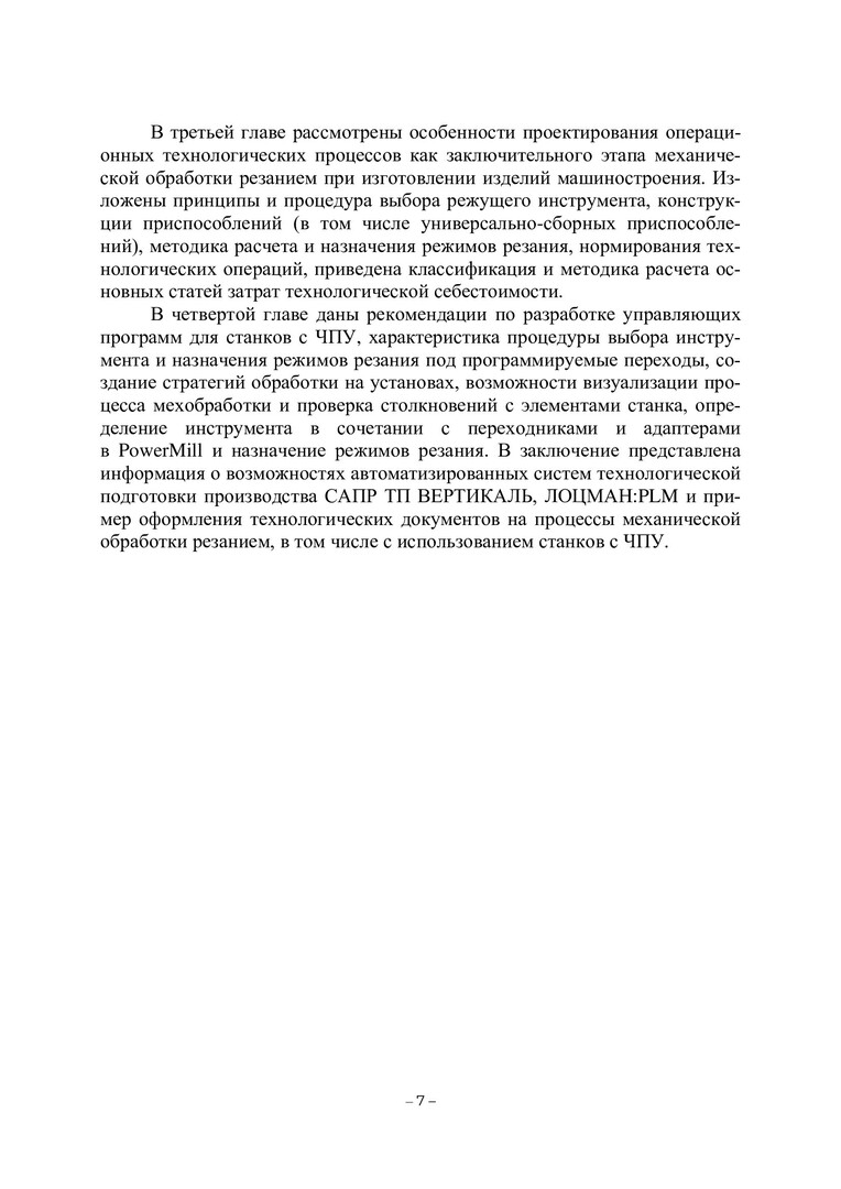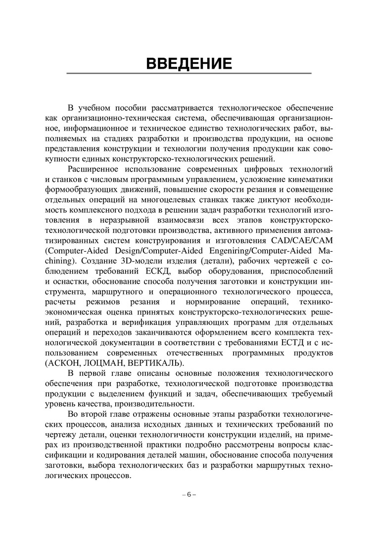 Аннотация: Рассматривается последовательность проведения комплексных конструкторско-технологических работ по подготовке (обеспечению) производства машиностроительной продукции на всех стадиях жизненного цикла с учетом их функциональной взаимосвязи при разработке маршрутных и операционных технологических процессов. Подробно описаны пошаговый алгоритм разработки управляющей программы в Power Mill, стратегии обработки на многоцелевых станках с ЧПУ и порядок оформления всего комплекта технологической документации на основе современных отечественных программных продуктов АСКОН (ВЕРТИКАЛЬ). Предназначено для бакалавров и магистрантов, обучающихся по направлениям «Конструкторско-технологическое обеспечение машиностроительных производств», «Управление качеством», «Метрология, стандартизация и сертификация».