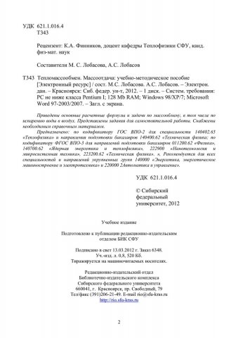 Библиографическое описание:Тепломассообмен. Массоотдача : учебно-методическое пособие для напр. подготовки бакалавров 011200.62 «Физика», 140700.62 «Ядерная энергетика и теплофизика», 222900 «Нанотехнология и микросистемная техника», 223200.62 «Техническая физика» / Сиб. федерал. ун-т ; сост.: М. С. Лобасова, А. С. Лобасов. - Электрон. текстовые дан. (PDF, 309 Кб). - Красноярск : СФУ, 2012. - Загл. с титул. экрана. - Библиогр.: с. 26. - Текст : электронный.