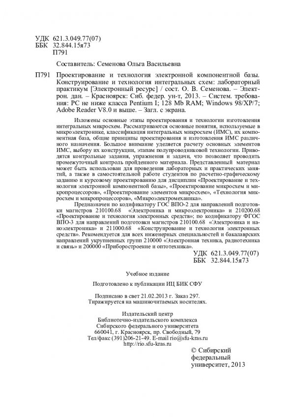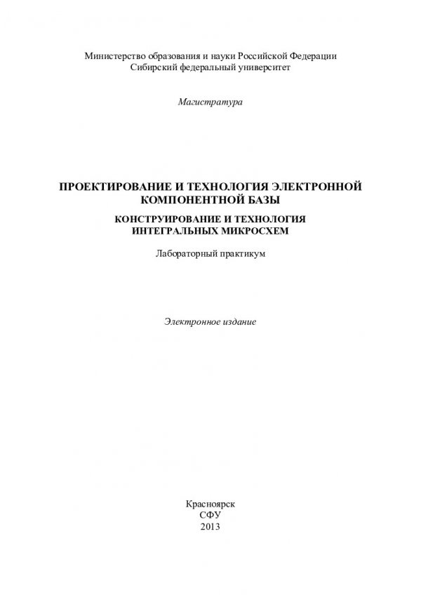Библиографическое описание:Проектирование и технология электронной компонентной базы. Конструирование и технология интегральных схем : лаб. практикум [для студентов напр. подг. 210100.68 «Электроника и наноэлектроника» и 211000.68 «Конструирование и технология электронных средств»] / Сиб. федерал. ун-т ; сост. О. В. Семенова. - Электрон. текстовые дан. (PDF, 2,4 Мб). - Красноярск : СФУ, 2013. - (Магистратура). - Загл. с титул. экрана. - Библиогр.: с.111. - Изд. № 2013-297. - Текст : электронный.
