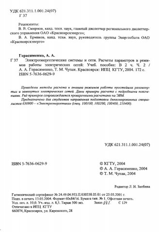 Библиографическое описание:Герасименко, Алексей Алексеевич. Электроэнергетические системы и сети. Расчеты параметров и режимов работы электрических сетей : учеб. пособие для вузов / А. А. Герасименко, Т. М. Чупак ; Краснояр. гос. техн. ун-т. - Красноярск : ИПЦ КГТУ, 2004 - . - Текст : непосредственный. + Текст : электронный. Ч. 2. - 2004. - 172 с.
