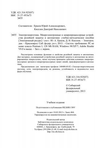 Библиографическое описание:Электроэнергетика. Микроэлектронные и микропроцессорные устройства релейной защиты и автоматики : учеб.-метод. пособие [для студентов программы подгот. 140400.68.02 «Электроэнергетические системы, сети, электропередачи, их режимы, устойчивость и надежность»] / Сиб. федерал. ун-т ; сост.: Ю. А. Ершов, Д. Н. Киселев. - Электрон. текстовые дан. (PDF, 2,2 Мб). - Красноярск : СФУ, 2013. - (Магистратура). - Загл. с титул. экрана. - Библиогр.: с. 87. - Изд. № 2013-464 : Б. ц. - Текст : непосредственный.