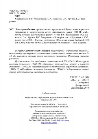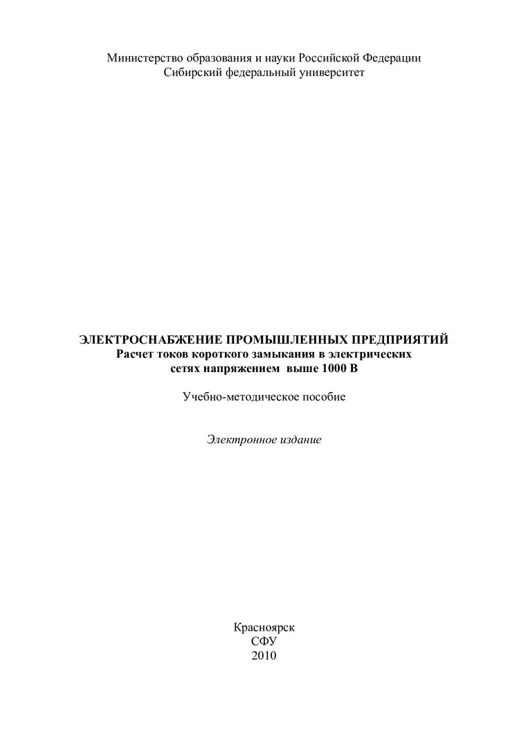 Библиографическое описание: Электроснабжение промышленных предприятий. Расчет токов короткого замыкания в электрических сетях напряжением выше 1000 В : учебно-методическое пособие для спец. 150102.65 «Металлургия цветных металлов», 150104.65 «Литейное производство черных и цветных металлов», 150105.65 «Металловедение и термическая обработка металлов», 150106.65 «Обработка металлов давлением», 150108.65 «Порошковая металлургия, композиционные материалы, покрытия» / Сиб. федерал. ун-т ; сост. В. С. Куликовский [и др.]. - Электрон. текстовые дан. (PDF, 434 Кб). - Красноярск : СФУ, 2012. - Загл. с титул. экрана. - Библиогр.: с. 35. - Б. ц. - Текст : электронный.