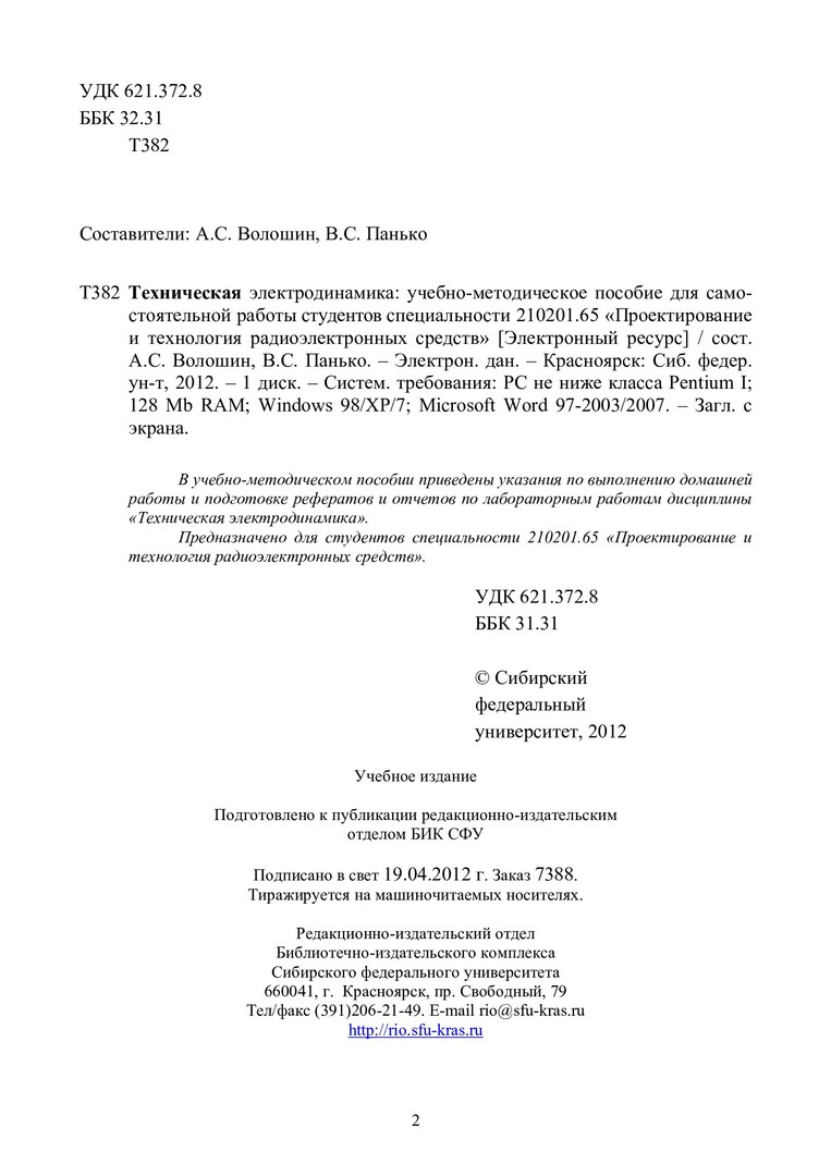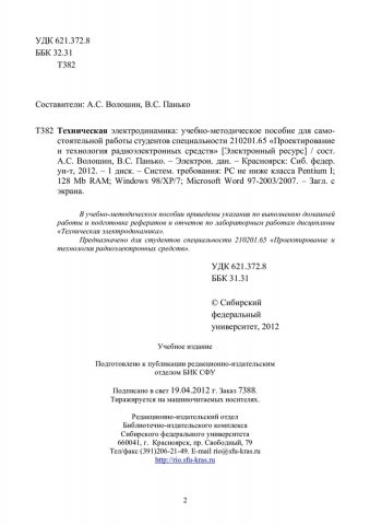 Библиографическое описание:Техническая электродинамика : учеб.-метод. пособие для самостоят. работы студентов спец. 210201.65 «Проектирование и технология радиоэлектронных средств» / Сиб. федерал. ун-т ; сост.: А. С. Волошин, В. С. Панько. - Электрон. текстовые дан. (PDF, 250 Кб). - Красноярск : СФУ, 2012. - Загл. с титул. экрана. - Библиогр.: с. 14. - Текст : электронный.