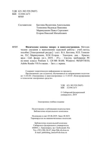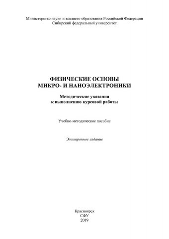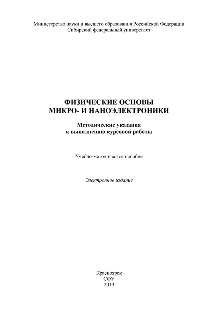 Библиографическое описание:Физические основы микро- и наноэлектроники. Методические указания к выполнению курсовой работы : учебно-методическое пособие / Сиб. федер. ун-т, Ин-т инж. физики и радиоэлектроники ; сост. В. А. Бахтина [и др.]. - Электрон. текстовые дан. (pdf, 0,7 Мб). - Красноярск : СФУ, 2019. - Загл. с титул. экрана. - Библиогр.: с. 21. - Изд. № 2019-8431 : Б. ц. - Текст : непосредственный.