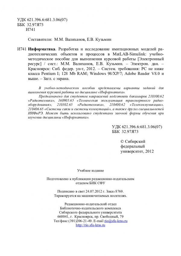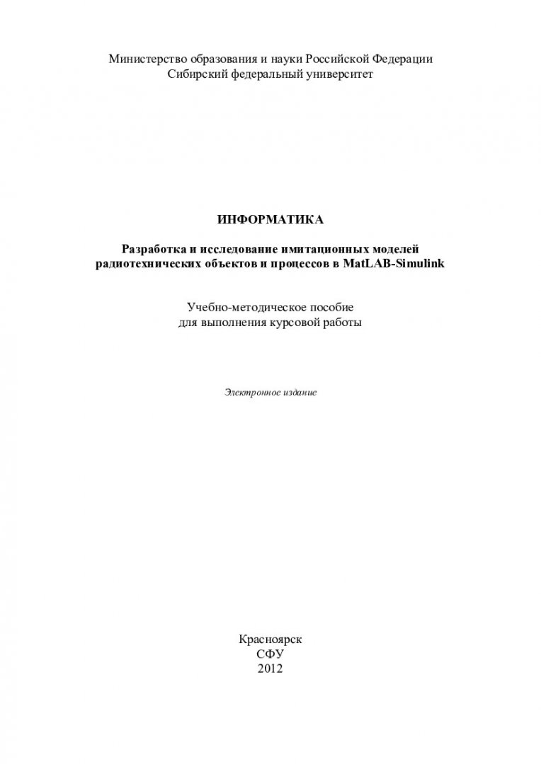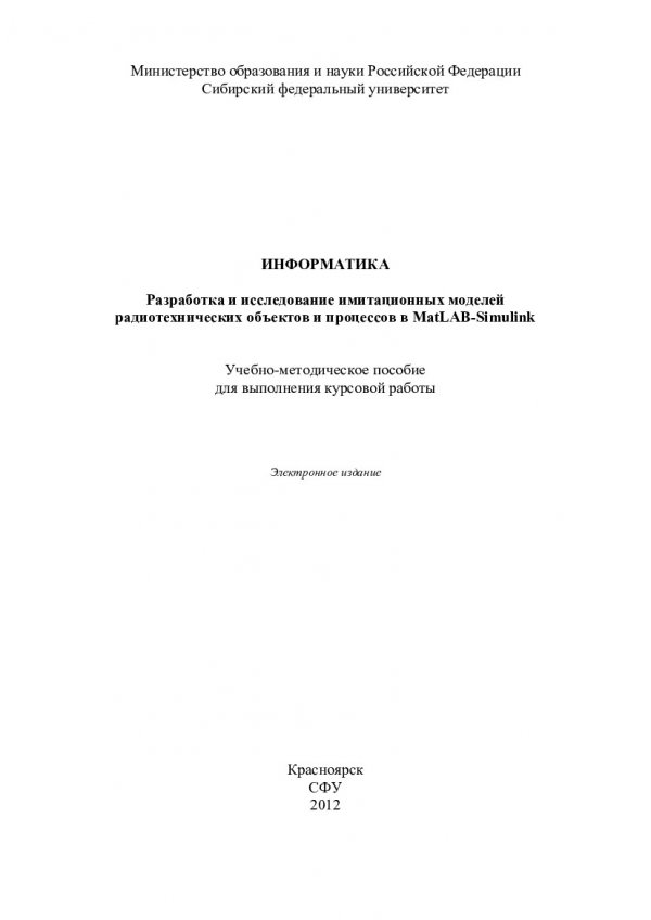 Библиографическое описание:Информатика. Разработка и исследование имитационных моделей радиотехнических объектов и процессов в MatLAB-Simulink : учебно-методическое пособие для курсовой работы [студентов спец. 210300.62 «Радиотехника», 160905.65 «Техническая эксплуатация транспортного радиооборудования», 210302.65 «Радиотехника», 210400.62 «Телекоммуникации», 210406.65 «Системы связи и системы коммутаций»] / Сиб. федерал. ун-т ; сост.: М. М. Валиханов, Е. В. Кузьмин. - Электрон. текстовые дан. (PDF, 0,2 Мб). - Красноярск : СФУ, 2012. - Загл. с титул. экрана. - Библиогр.: с. 10. - Текст : непосредственный.