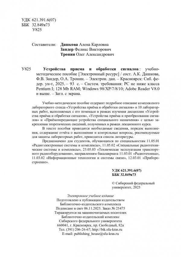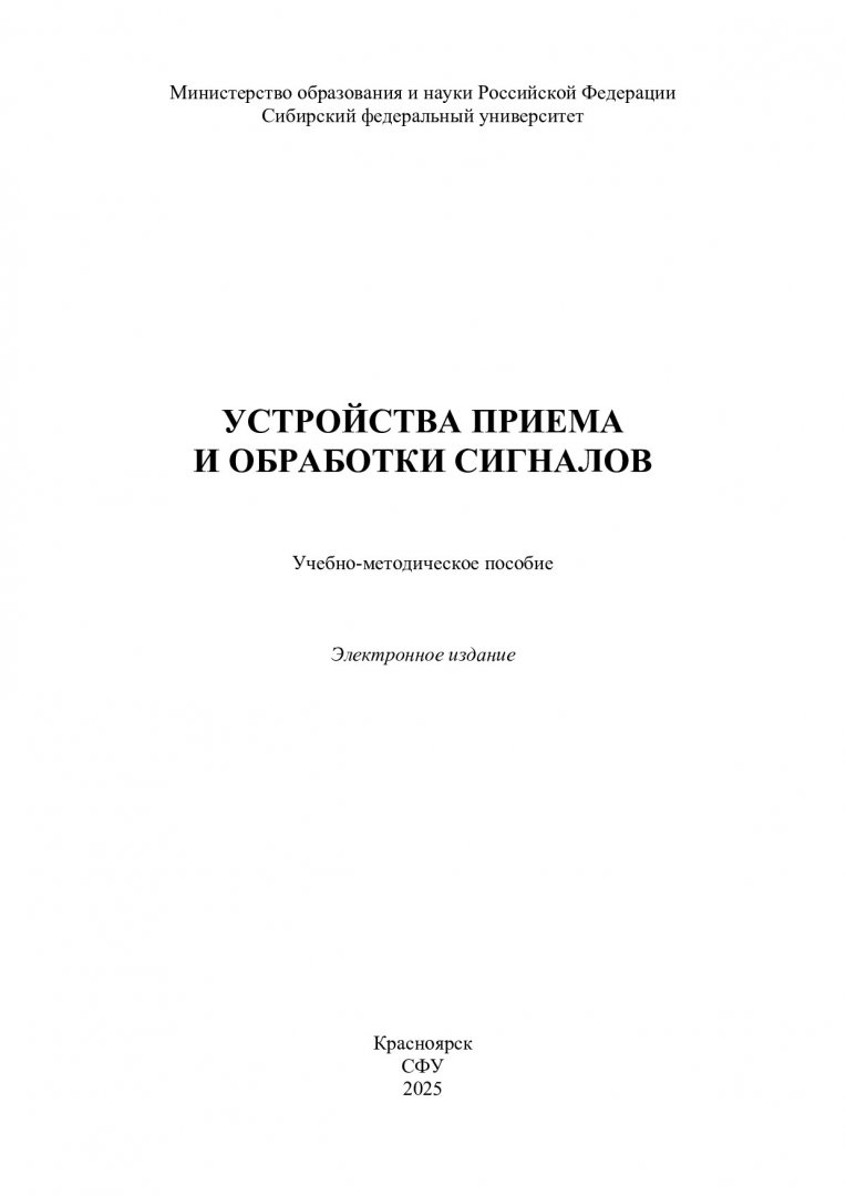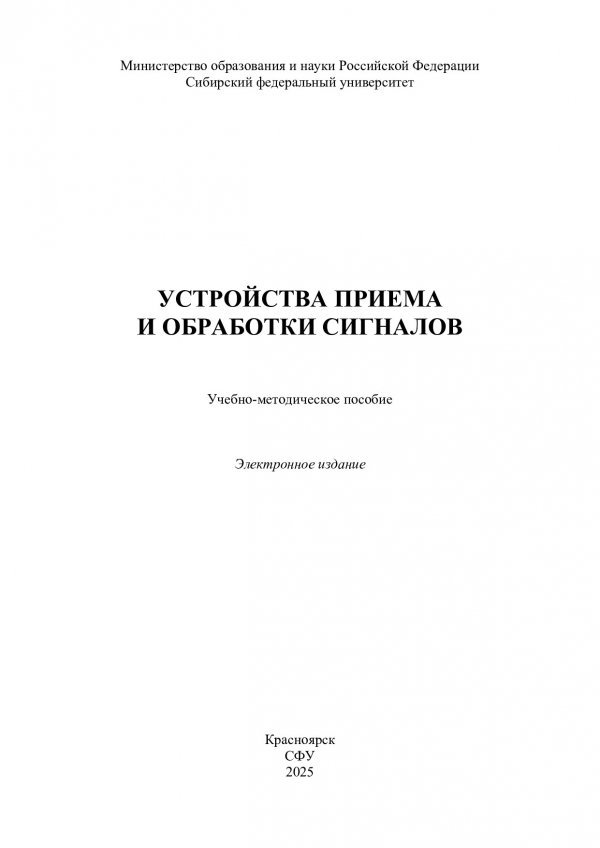 Библиографическое описание: Устройства приема и обработки сигналов : учебно-методическое пособие / Сибирский федеральный университет, Институт инженерной физики и радиоэлектроники ; сост.: А. К. Дашкова, Ф. В. Зандер, О. А. Тронин. - Электрон. текстовые дан. (pdf, 2.1 Мб). - Красноярск : СФУ, 2025 (2025-11-06). - 93 с. - Загл. с титул. экрана. - Библиогр.: с. 93. - Изд. № 2025-25475 : Б. ц. - Текст : электронный.