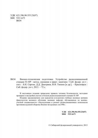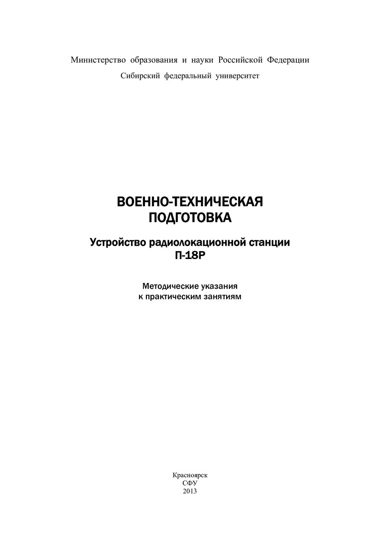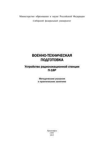 Библиографическое описание:Военно-техническая подготовка. Устройство радиолокационной станции П-18Р : метод. указ. к практическим занятиям / Сиб. федерал. ун-т ; сост. Б. К. Саргин [и др.]. - Красноярск : СФУ, 2013. - 71 с. - 100 экз. - Изд. № 2013-2456 : 62.00 р. - Текст : непосредственный + Текст : электронный.
