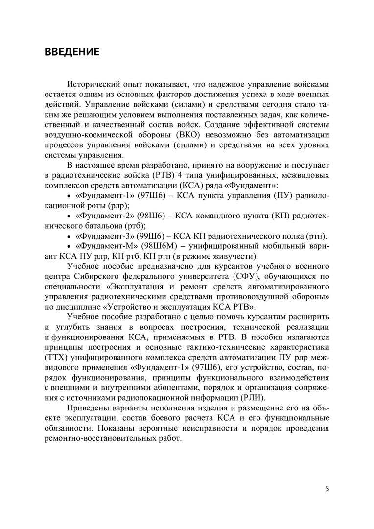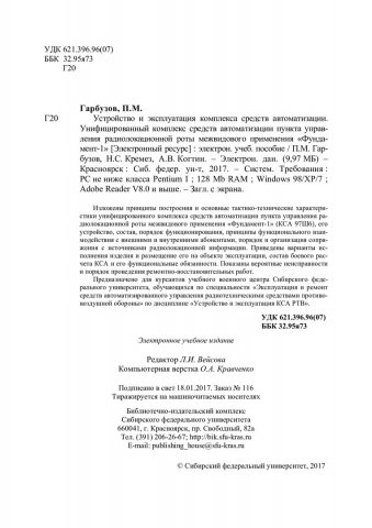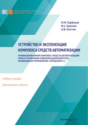 Библиографическое описание:Устройство и эксплуатация комплекса средств автоматизации. Унифицированный комплекс средств автоматизации пункта управления радиолокационной роты межвидового применения "Фундамент-1" : электронное учебное пособие [для курсантов УВЦ СФУ по специальности «Эксплуатация и ремонт средств автоматизированного управления радиотехническими средствами противовоздушной обороны»] / Сиб. федер. ун-т, Воен.-инж. ин-т ; сост.: П. М. Гарбузов, Н. С. Кремез, А. В. Когтин. - Электрон. текстовые дан. (pdf, 10 Мб). - Красноярск : СФУ, 2017. - 137 с. - Загл. с титул. экрана. - Изд. № 2017-116 : Б. ц. - Текст : электронный.