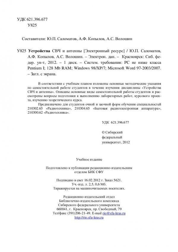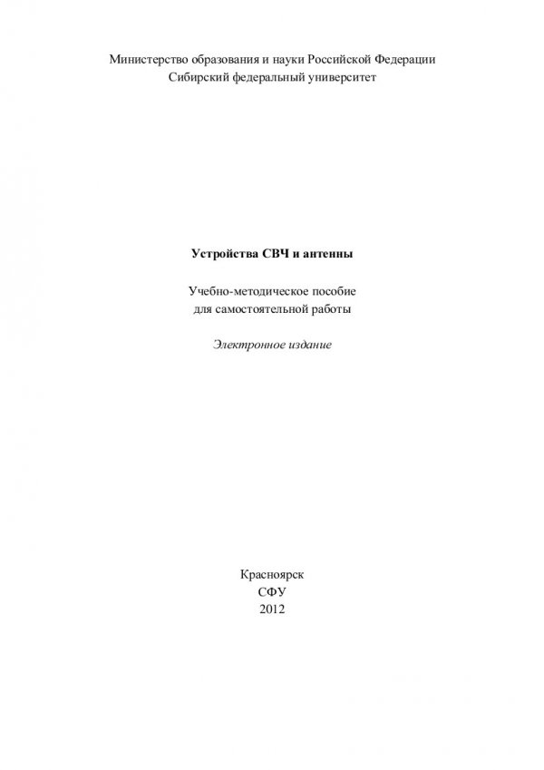 Библиографическое описание:Устройства СВЧ и антенны : учебно-методическое пособие для самостоятельной работы / Сиб. федерал. ун-т ; сост.: Ю. П. Саломатов, А. Ф. Копылов, А. С. Волошин. - Электрон. текстовые дан. (PDF, 0,8 Мб). - Красноярск : СФУ, 2012. - Загл. с титул. экрана. - Текст : электронный.
