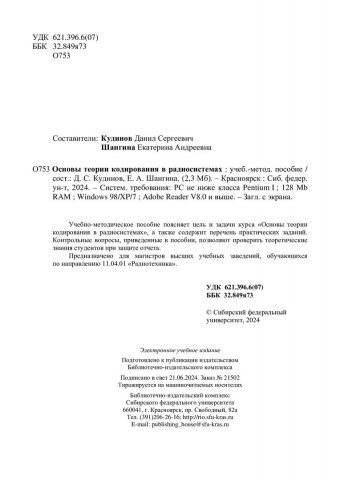 Библиографическое описание: Основы теории кодирования в радиосистемах : учебно-методическое пособие / Сиб. федер. ун-т, Ин-т инж. физики и радиоэлектроники ; сост.: Д. С. Кудинов, Е. А. Шангина. - Электрон. текстовые дан. (pdf, 2,5 Мб). - Красноярск : СФУ, 2024 (2024-06-21). - 64 с. - Загл. с титул. экрана. - Изд. № 2024-21502 : Б. ц. - Текст : электронный.