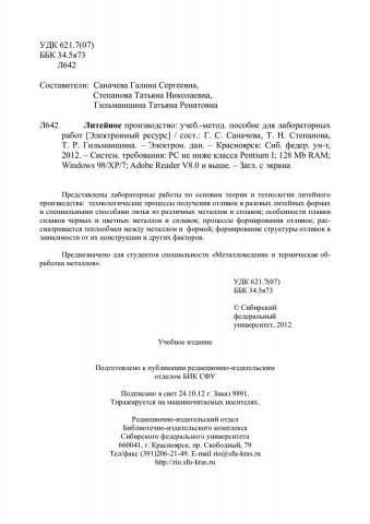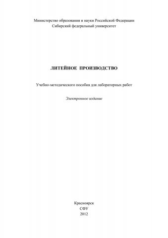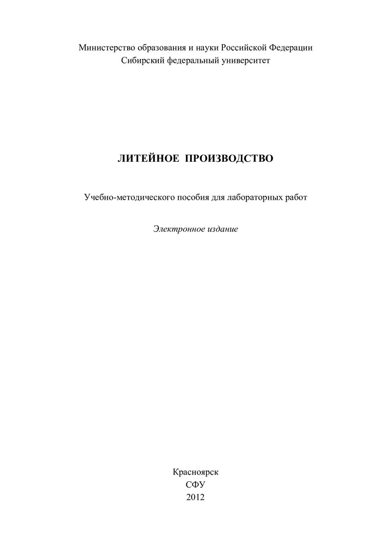 Библиографическое описание:Литейное производство : учеб.-метод. пособие для лаб. работ [для студентов спец. 110500 "Металловедение и термическая обработка металлов"] / Сиб. федерал. ун-т ; сост.: Г. С. Саначева, Т. Н. Степанова, Т. Р. Гильманшина. - Электрон. текстовые дан. (PDF, 1,2 Мб). - Красноярск : СФУ, 2012. - Загл. с титул. экрана. - Библиогр.: с. 40. - Б. ц. - Текст : электронный.