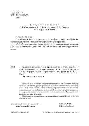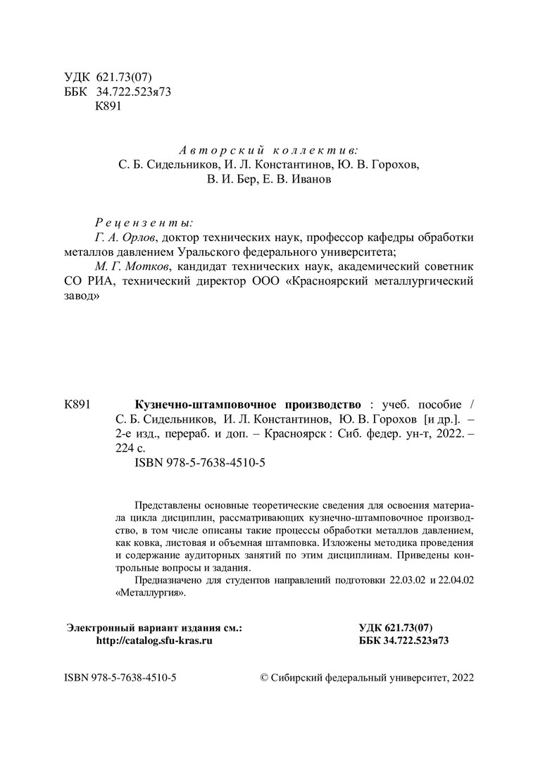 Библиографическое описание: Кузнечно-штамповочное производство : учебное пособие / С. Б. Сидельников, И. Л. Константинов, Ю. В. Горохов [и др.]. ; Сибирский федеральный университет, Институт цветных металлов и материаловедения. - 2-е изд., перераб. и доп. - Электрон. текстовые дан. (pdf ; 7,0 Мб). - Красноярск : СФУ, 2022 (2022-03-06). - 224 с., 14.0 усл. печ. л. : рис., табл. - Загл. с титул. экрана. - Электрон. версия печ. публикации . - Библиогр.: с. 215-216. - 100 экз. - ISBN 978-5-7638-4510-5 : Б. ц. - Изд. № 2021-13505. - Текст : электронный.Является аналогом :