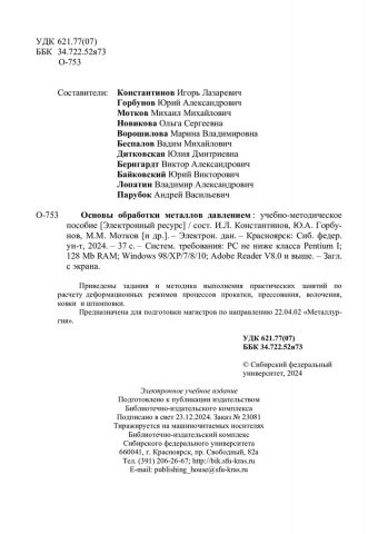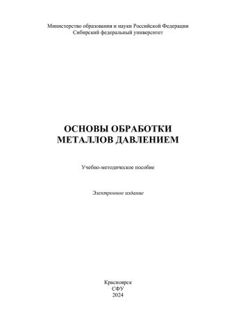 Библиографическое описание: Основы обработки металлов давлением : учебно-методическое пособие / Сибирский федеральный университет, Институт цветных металлов ; сост.: И. Л. Константинов, О. А. Горбунов, М. М. Мотков [и др.]. - Электрон. текстовые дан. (pdf, 1 Мб). - Красноярск : СФУ, 2024. - 37 с. - Загл. с титул. экрана. - Изд. № 2024-23081 : Б. ц. - Текст : электронный.