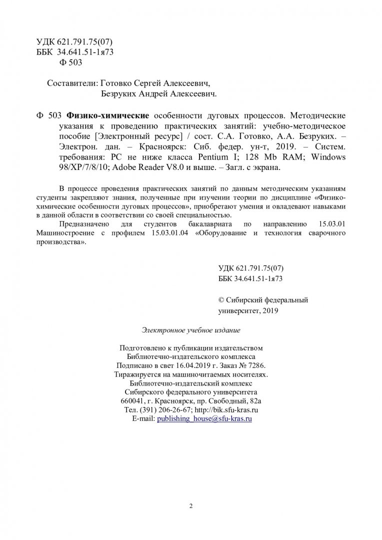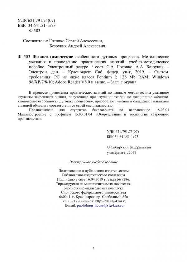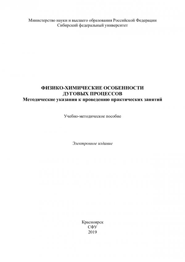 Библиографическое описание:Физико-химические особенности дуговых процессов : методические указания к проведению практических занятий : учебно-методическое пособие / Сиб. федер. ун-т, Политехн. ин-т ; сост.: С. А. Готовко, А. А. Безруких. - Электрон. текстовые дан. (pdf, 2,3 Мб). - Красноярск : СФУ, 2019. - Загл. с титул. экрана. - Изд. № 2018-7286 : Б. ц. - Текст : непосредственный.
