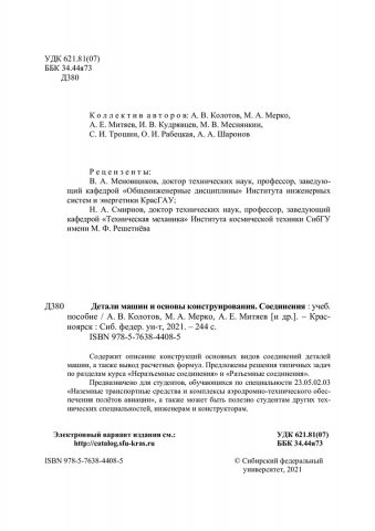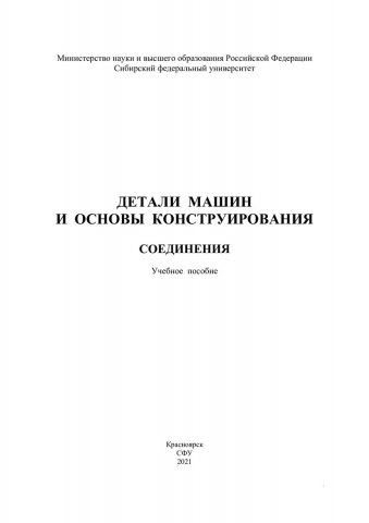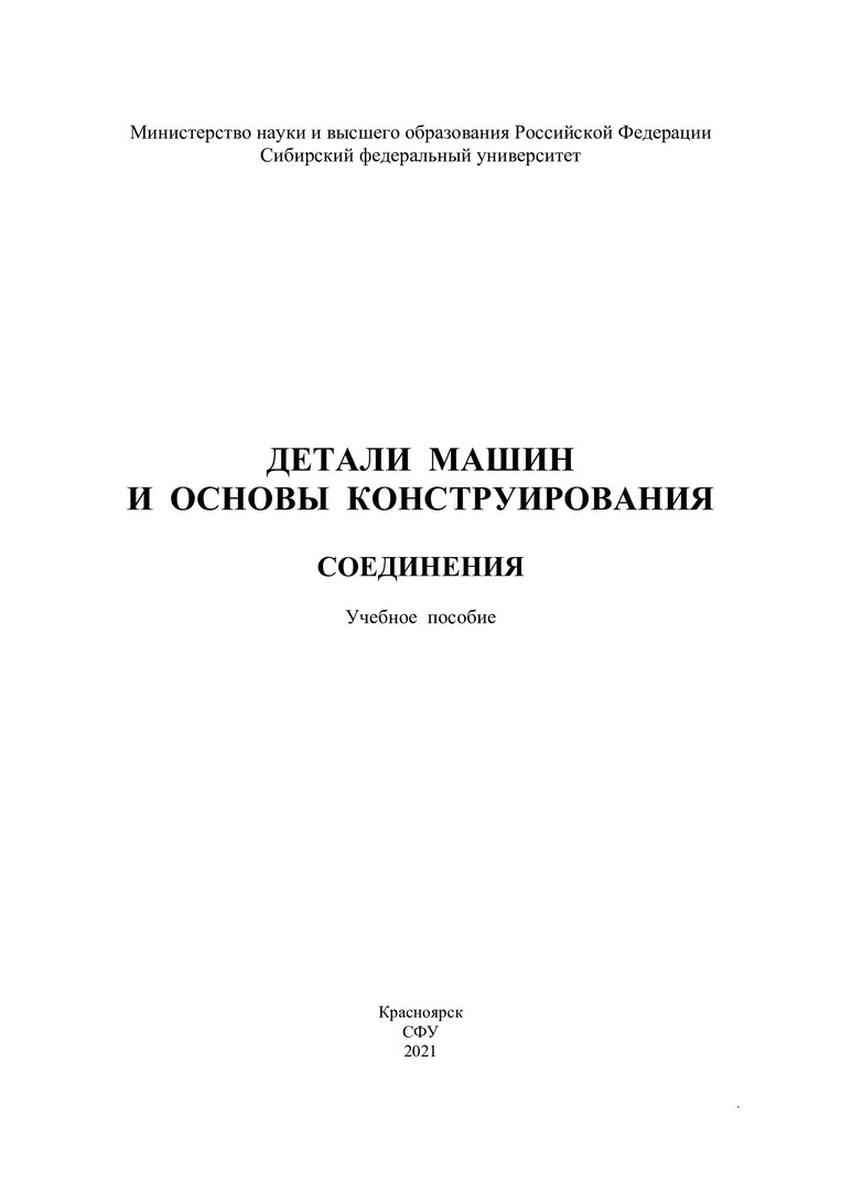 Библиографическое описание: Детали машин и основы конструирования. Соединения : учебное пособие / А. В. Колотов, М. А. Мерко, А. Е. Митяев [и др.]. ; Сибирский федеральный университет, Политехнический институт. - Красноярск : СФУ, 2021 (2021-10-27). - 244 с., 15.3 усл. печ. л. - Библиогр.: с. 242. - 100 экз. - ISBN 978-5-7638-4408-5 : 545.00 р. - Изд. № 2020-11896. - Текст : непосредственный + Текст : электронный.