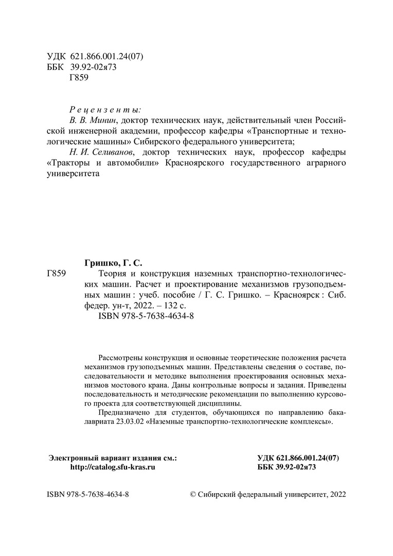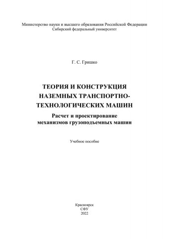 Библиографическое описание: Гришко, Григорий Сергеевич. Теория и конструкция наземных транспортно-технологических машин. Расчет и проектирование механизмов грузоподъемных машин : учебное пособие / Г. С. Гришко ; рец.: В. В. Минин, Н. И. Селиванов ; Сибирский федеральный университет, Политехнический институт. - Электрон. текстовые дан. (5,9 Мб). - Красноярск : СФУ, 2022 (2022-12-07). - 132 с., 8.3 усл. печ. л. : ил., табл. - Загл. с титул. экрана. - Электрон. версия печ. публикации . - Библиогр.: с. 130-131. - 100 экз. - ISBN 978-5-7638-4634-8 : Б. ц. - Изд. № 2021-15234. - Текст : электронный.
