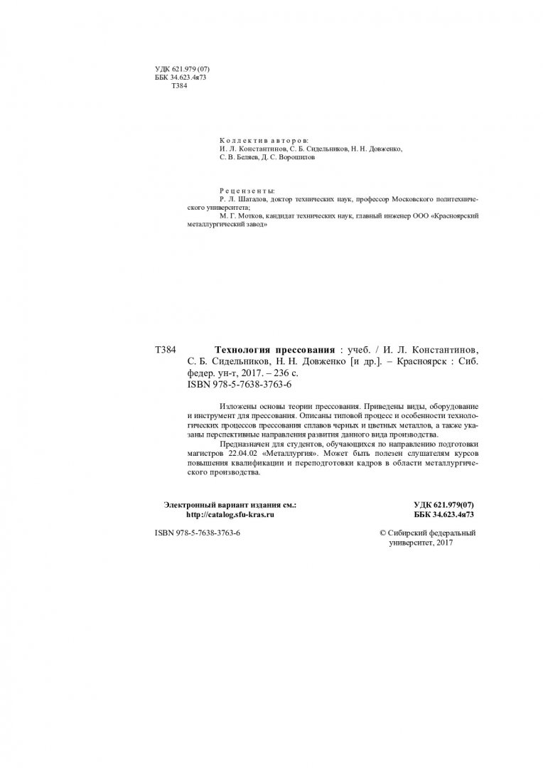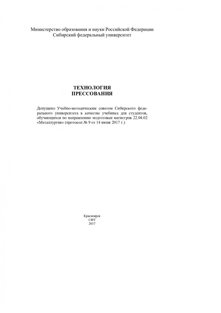 Библиографическое описание: Технология прессования : учебник для студентов, обучающихся по направлению подготовки магистров 22.04.02 "Металлургия" / И. Л. Константинов [и др.]. ; Сиб. федер. ун-т, Ин-т цвет. металлов и материаловедения. - Красноярск : СФУ, 2017. - 234 с. - (Учебник Сибирского федерального университета). - Библиогр.: с. 230-231. - 500 экз. - ISBN 978-5-7638-3763-6 : 985.00 р. - Изд. № 2017-2708. - Текст : непосредственный + Текст : электронный.