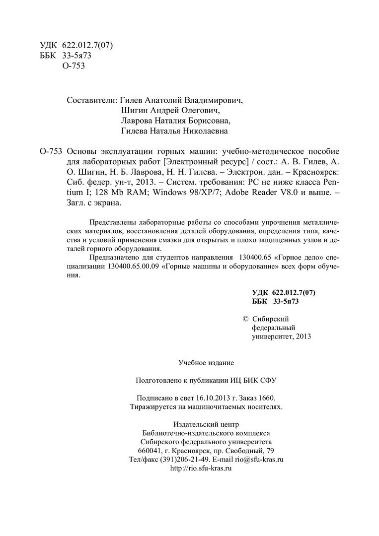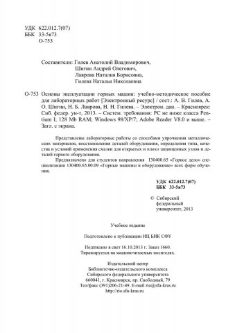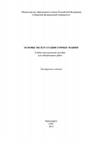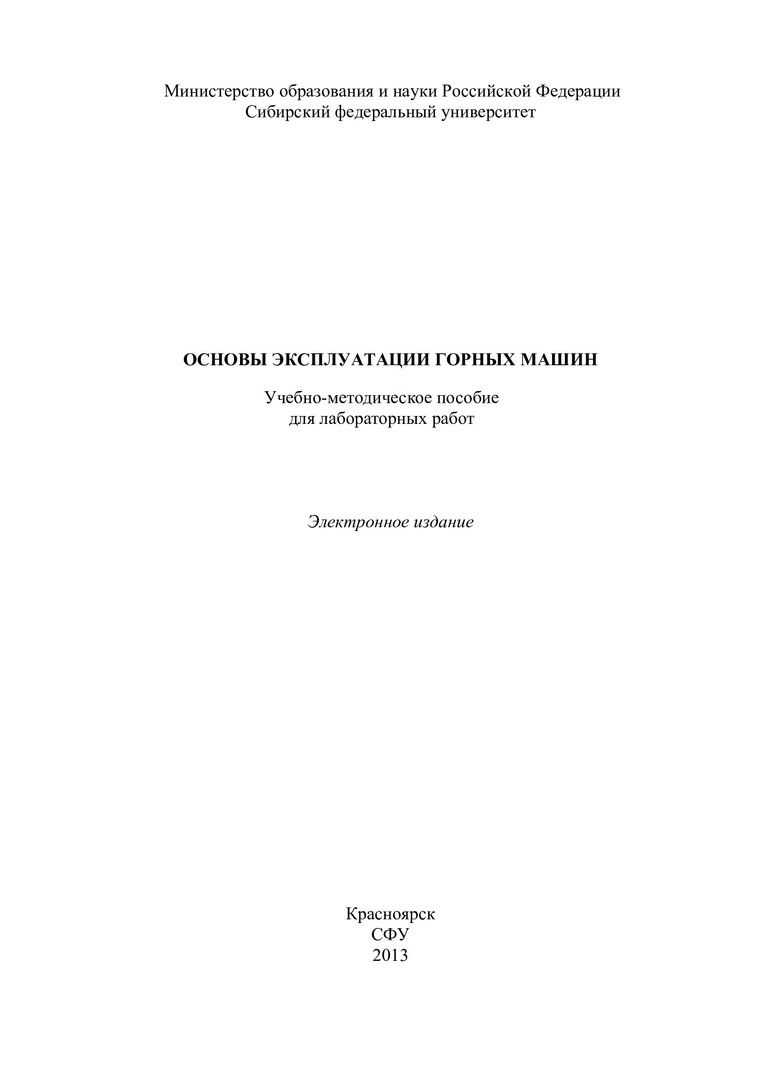 Библиографическое описание:Основы эксплуатации горных машин : учебно-методическое пособие для лабораторных работ [для студентов спец. 130400.65 «Горное дело» спец. 130400.65.00.09 «Горные машины и оборудование»] / Сиб. федерал. ун-т ; сост. А. В. Гилев [и др.]. - Электрон. текстовые дан. (PDF, 2 Мб). - Красноярск : СФУ, 2013. - Загл. с титул. экрана. - Изд. № 2013-1660. - Текст : электронный.