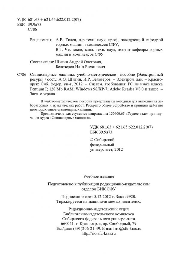 Библиографическое описание:Стационарные машины : учебно-методическое пособие [для студентов напр. 130400.65 «Горное дело»] / Сиб. федерал. ун-т ; сост.: А. О. Шигин, И. Р. Белозеров. - Электрон. текстовые дан. (PDF, 1,8 Мб). - Красноярск : СФУ, 2012. - Загл. с титул. экрана. - Библиогр.: с. 65. - Б. ц. - Текст : электронный.