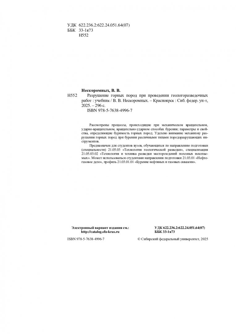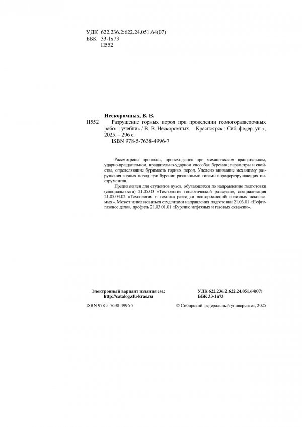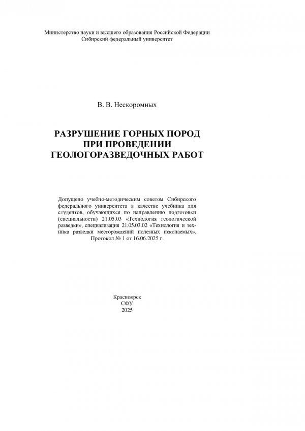 Библиографическое описание: Нескоромных, Вячеслав Васильевич. Разрушение горных пород при проведении геологоразведочных работ : учебник / В. В. Нескоромных ; Сиб. федер. ун-т, Ин-т цветных металлов. - Электрон. текстовые дан. (pdf, 12.3 Мб). - Красноярск : СФУ, 2025 (2025-11-20). - 296 с., 18.5 усл. печ. л. - Загл. с титул. экрана. - Электрон. версия печ. публикации . - 500 экз. - ISBN 978-5-7638-4996-7 : Б. ц. - Изд. № 2024-22052. - Текст : непосредственный + Текст : электронный.