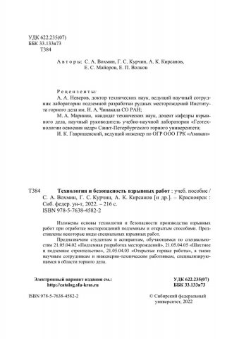 Библиографическое описание: Технология и безопасность взрывных работ : учебное пособие / С. А. Вохмин, Г. С. Курчин, А. К. Кирсанов [и др.]. ; Сибирский федеральный университет, Институт горного дела, геологии и геотехнологий. - Красноярск : СФУ, 2022 (2022-02-14). - 216 с., 13.5 усл. печ. л. : табл., рис., цв. ил. - Библиогр.: с. 208-212. - 100 экз. - ISBN 978-5-7638-4582-2 : 1209.00 р. - Изд. № 2021-14629. - Текст : непосредственный : электронный.