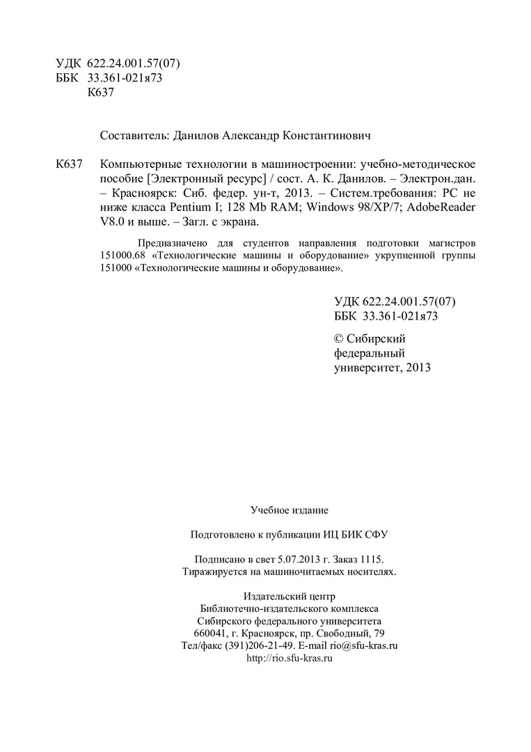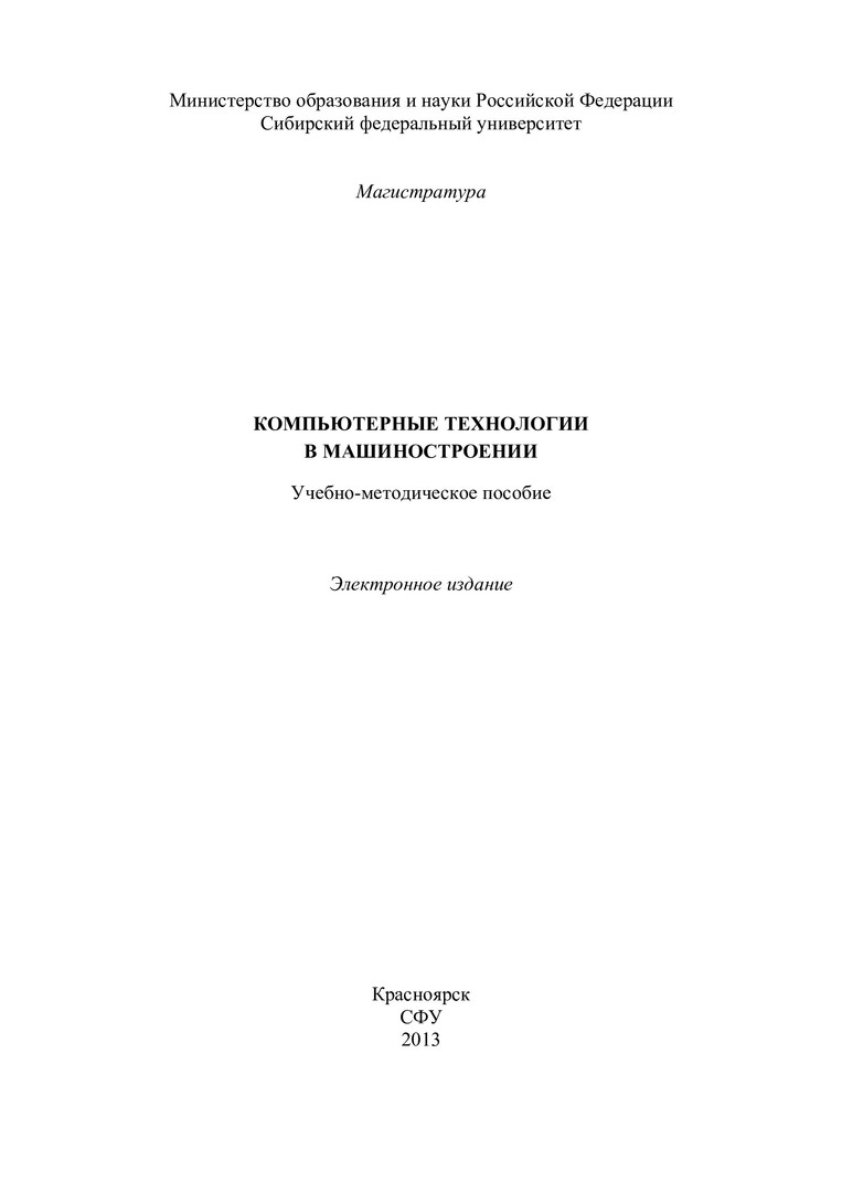 Библиографическое описание:Компьютерные технологии в машиностроении : учеб.-метод. пособие [для магистрантов напр. 151000.68 «Технологические машины и оборудование»] / Сиб. федерал. ун-т ; сост. А. К. Данилов. - Электрон. текстовые дан. (PDF, 3,6 Мб). - Красноярск : СФУ, 2013. - (Магистратура). - Загл. с титул. экрана. - Библиогр.: с. 101. - Изд. № 2013-1115. - Текст : электронный.